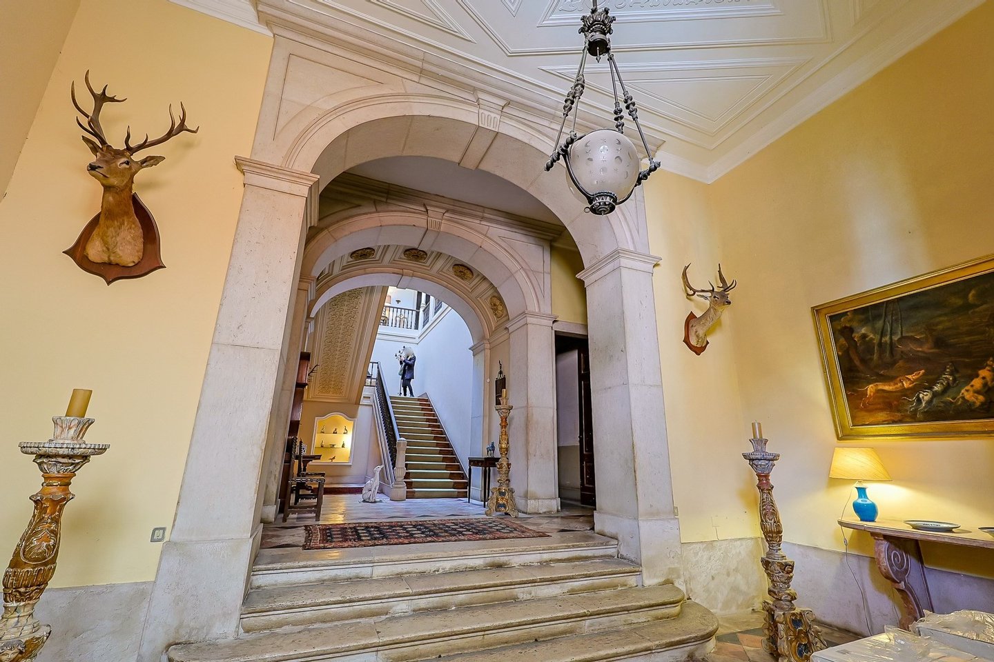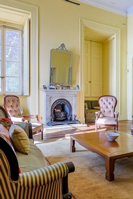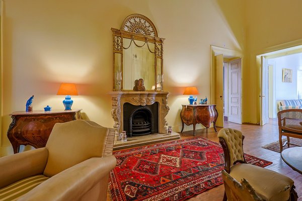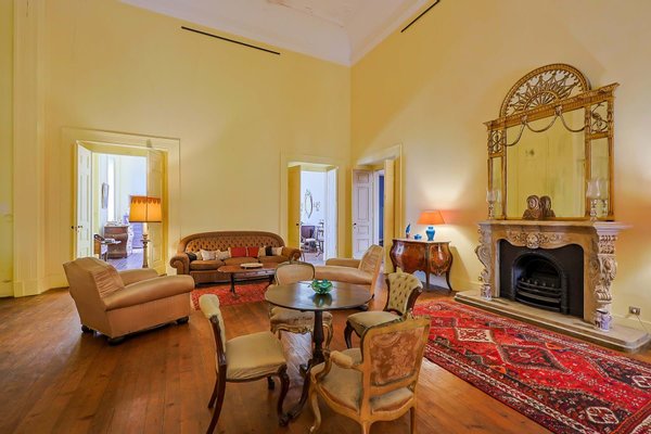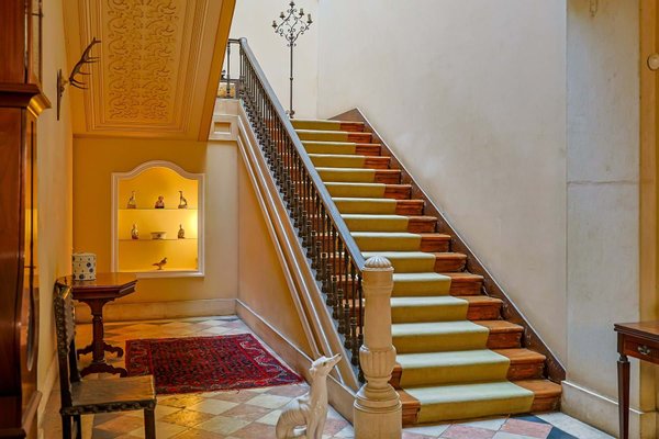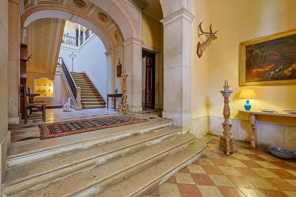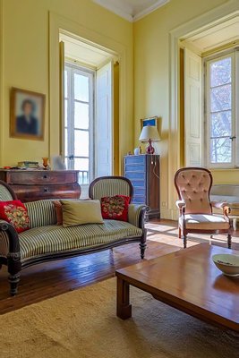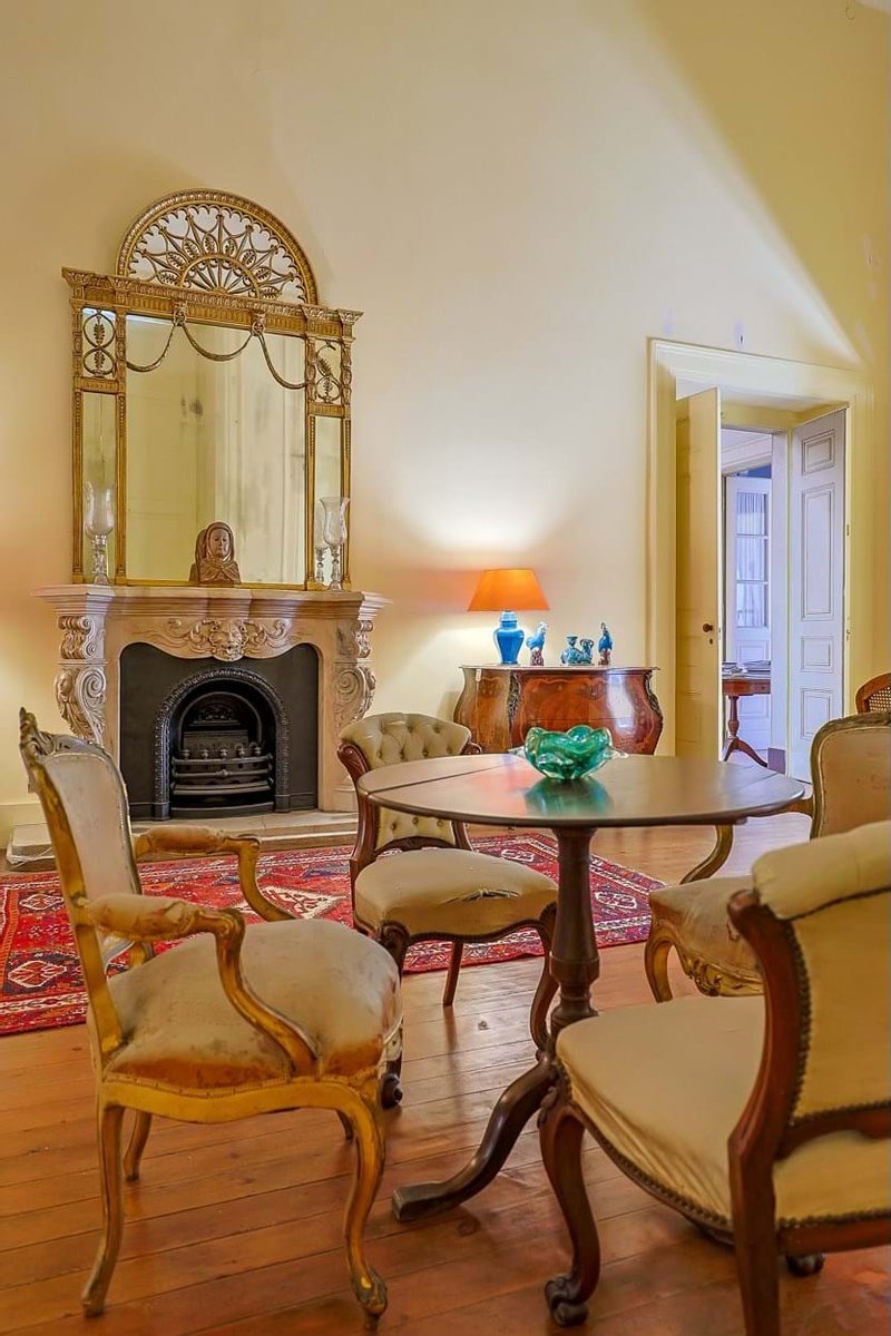 Im Inneren präsentiert das Palacete imposante neoklassizistische Architektur, eine symmetrische Fassade und prächtige Innenräume, die sich um eine dramatische, mit Wolken beleuchtete Eingangshalle und eine weite Treppe konzentrieren. Das Erdgeschoss umfasst einen eleganten Speisesalon mit Jakaranda-Möbeln aus dem 19. Jahrhundert, eine elegante Bibliothek und zusätzliche Gesellschaftsräume. Auf der oberen Ebene öffnen sich drei Empfangsräume, darunter eine charmante Café-Lounge, auf Terrassen mit Blick auf die Gärten und den schimmernden Tejo, wo das Grundstück etwa 145 Meter Flussufer bietet.