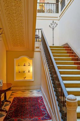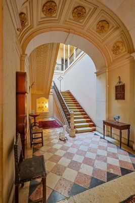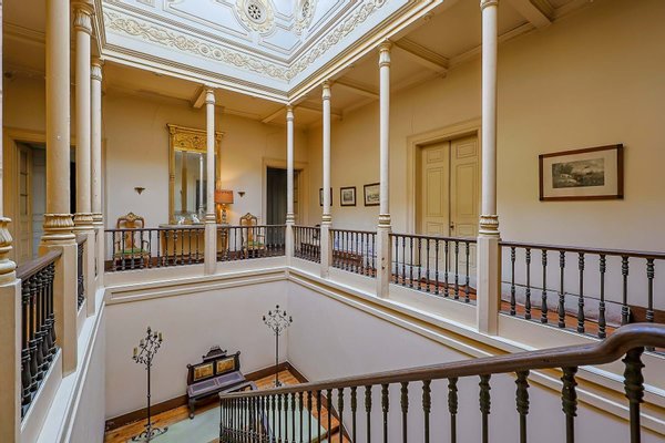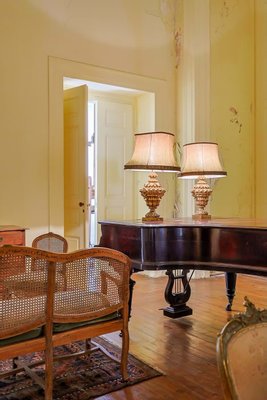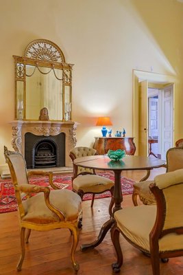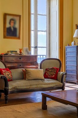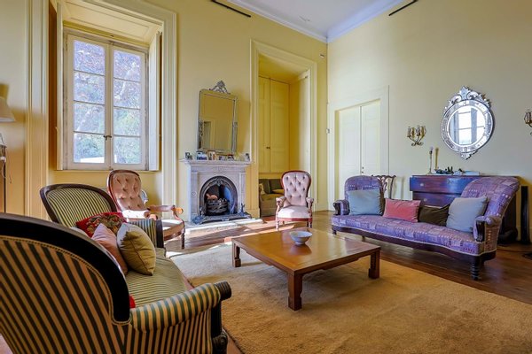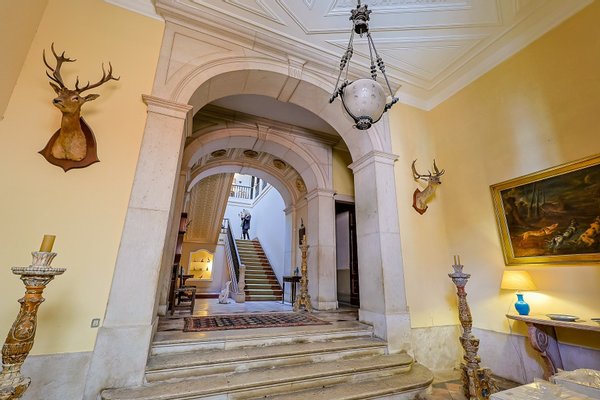 Im Inneren präsentiert das Palacete imposante neoklassizistische Architektur, eine symmetrische Fassade und prächtige Innenräume, die sich um eine dramatische, mit Wolken beleuchtete Eingangshalle und eine weite Treppe konzentrieren. Das Erdgeschoss umfasst einen eleganten Speisesalon mit Jakaranda-Möbeln aus dem 19. Jahrhundert, eine elegante Bibliothek und zusätzliche Gesellschaftsräume. Auf der oberen Ebene öffnen sich drei Empfangsräume, darunter eine charmante Café-Lounge, auf Terrassen mit Blick auf die Gärten und den schimmernden Tejo, wo das Grundstück etwa 145 Meter Flussufer bietet.