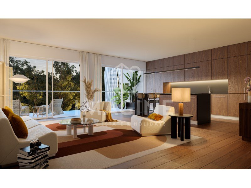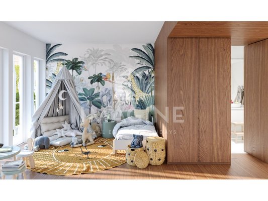 Der Hauptraum, geräumig und gut ausgerichtet, öffnet sich zum Balkon und erweitert den gesellschaftlichen Raum mit Blick über das Tal und den Tejo. Die freistehende Küche ist ein Design- und Funktionalitätsstück, ausgestattet mit SMEG, Bora Pure Serie und Quooker, die Corian-Arbeitsplatten und natürliche Holzschränke integrieren. Ein separater Waschraum und diskrete Lagerräume sorgen für Effizienz und Ordnung im Alltag.