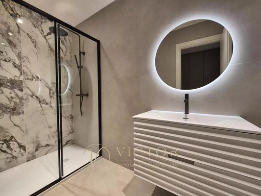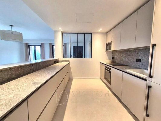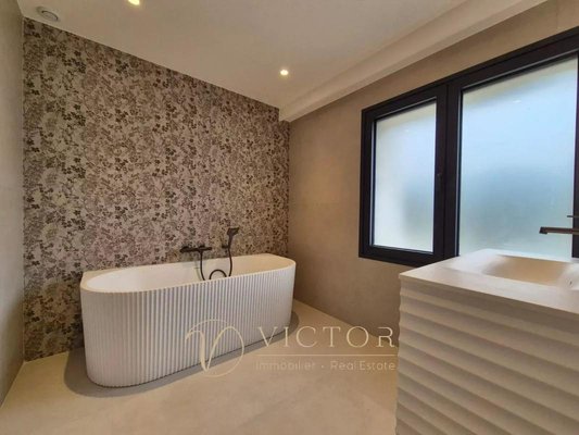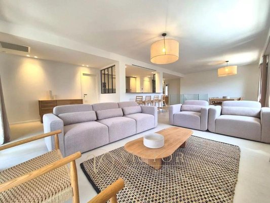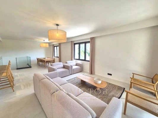 Wohnzimmer mit Küche von 70m² - 5 Schlafzimmer - 4 Badezimmer - Dachterrasse von 100m², freier Blick, 2 Garagen, mehrere Parkplätze.