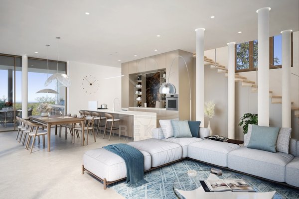 Auf 1.100 m² Grundstücksfläche entsteht eine moderne Villa mit 380 m² Wohnfläche auf drei Ebenen. Der Außenbereich zeigt sich gepflegt und einladend. Garten, Infinity-Pool mit Sonnenterrasse und eine Außenküche schaffen Raum für das Leben im Freien. Gesellige Abende eingeschlossen.