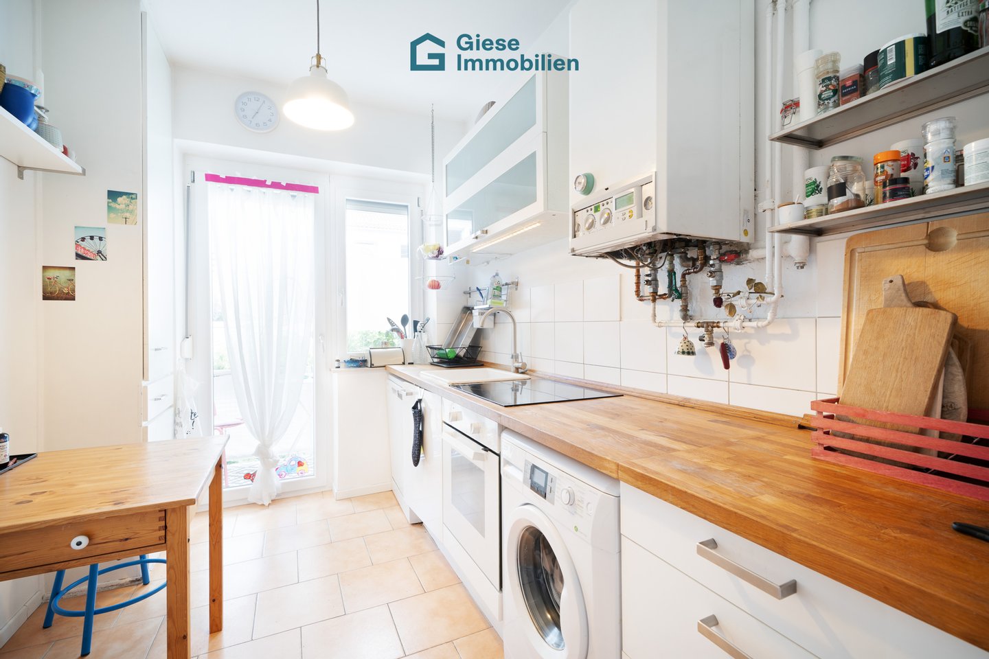 Die separate Küche ist funktional geschnitten und bietet ausreichend Arbeitsfläche. Von hier aus gelangen Sie direkt auf den kleinen Balkon, der zu einem Morgenkaffee oder entspannte Momente an der frischen Luft einläd.