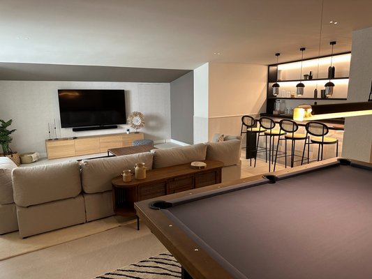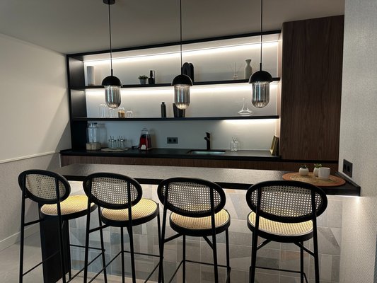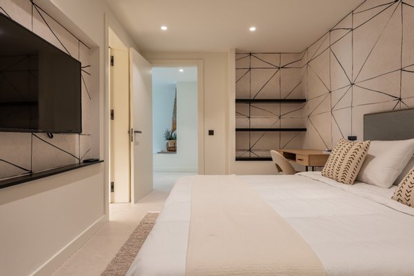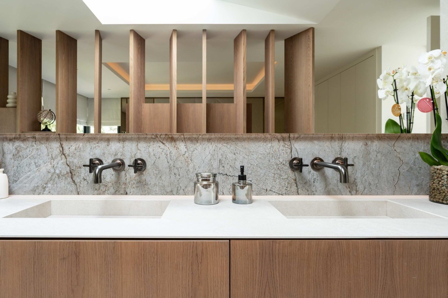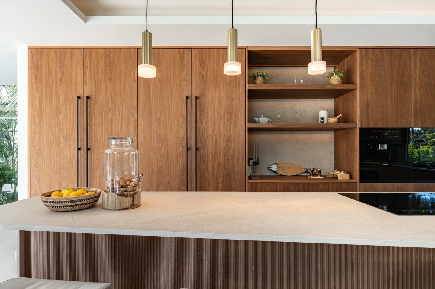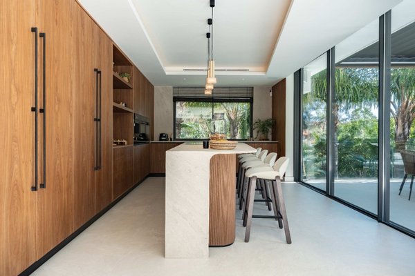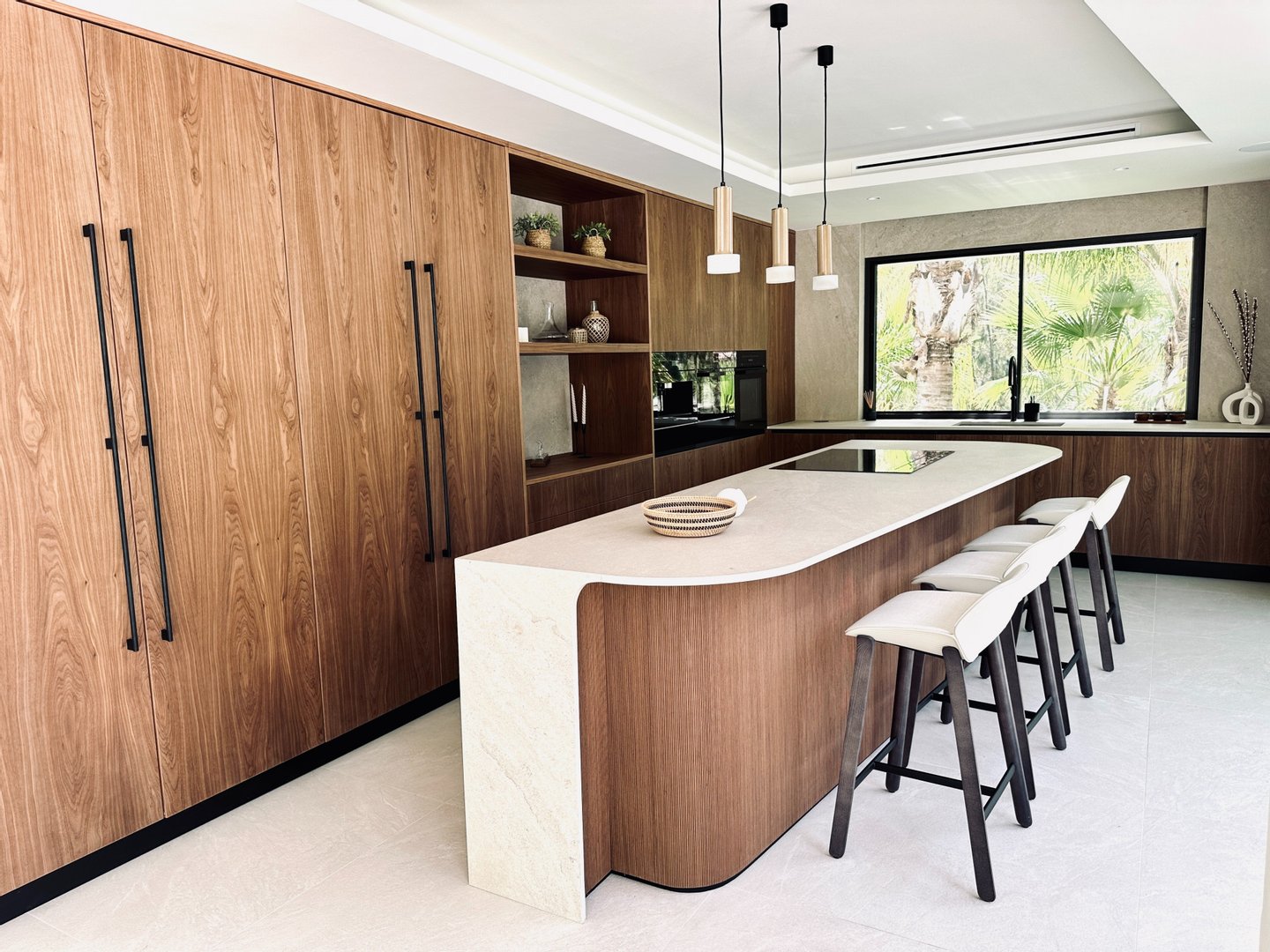 Das offene Küchendesign geht nahtlos in die geräumigen Wohn- und Essbereiche über und ist mit hochwertigen Geräten sowie modernen Oberflächen ausgestattet. Bodentiefe Fenster fluten das Innere mit Tageslicht und führen auf weitläufige Terrassen, auf denen eine bioklimatische elektrische Pergola für Schatten und Stil sorgt. Der beheizte Pool, der im Winter bis zu 35°C erreicht, lädt zum Entspannen ein und ist von üppigem Grün umgeben, das absolute Privatsphäre gewährleistet.