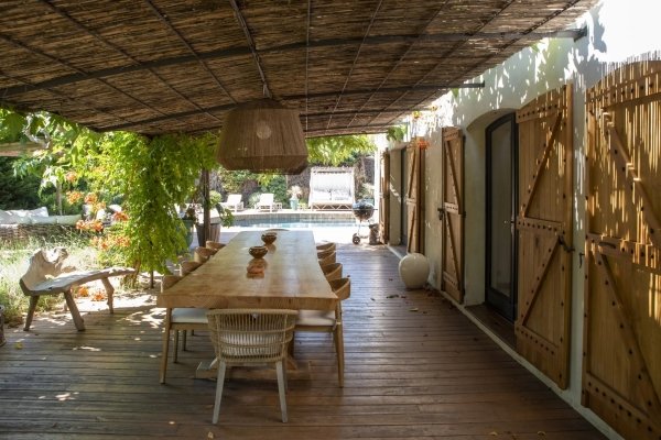 ein Speisesaal mit direktem Zugang zu einer Terrasse, die von einer Pergola beschattet wird, sowie eine moderne, voll ausgestattete Küche.