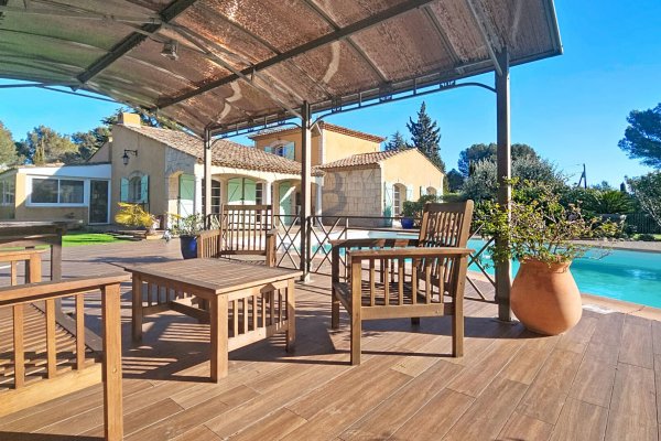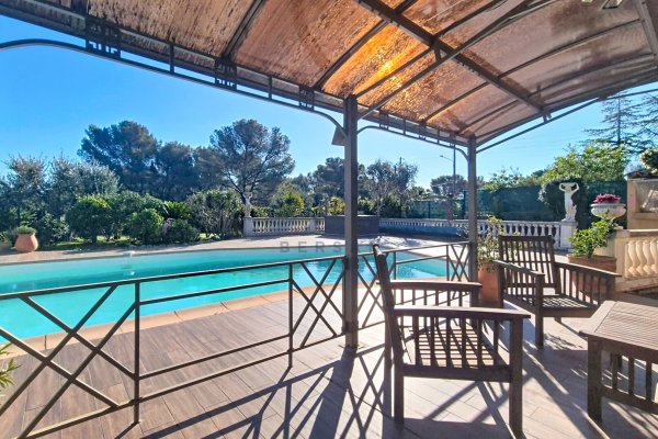 On one level, the villa consists of an entrance, a large bright living room with generous volumes, largely open to the terrace and the pool area. The kitchen of about 30 m² blends harmoniously into the living space and is extended by a veranda opening onto the garden, providing an additional room that is particularly pleasant in all seasons.