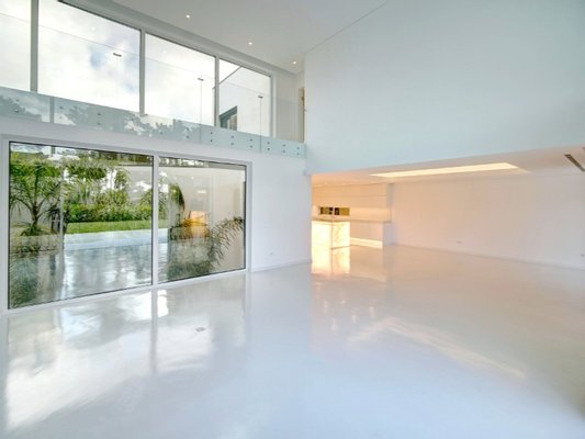 Das Erdgeschoss ist den Wohnbereichen gewidmet und als klar strukturierter, zusammenhängender Raum konzipiert. Der Haupteingang zeichnet sich durch eine vollständig verspiegelte Eingangstür mit 3 Metern Höhe aus, die bereits beim Betreten den architektonischen Maßstab und Charakter der Villa unterstreicht.