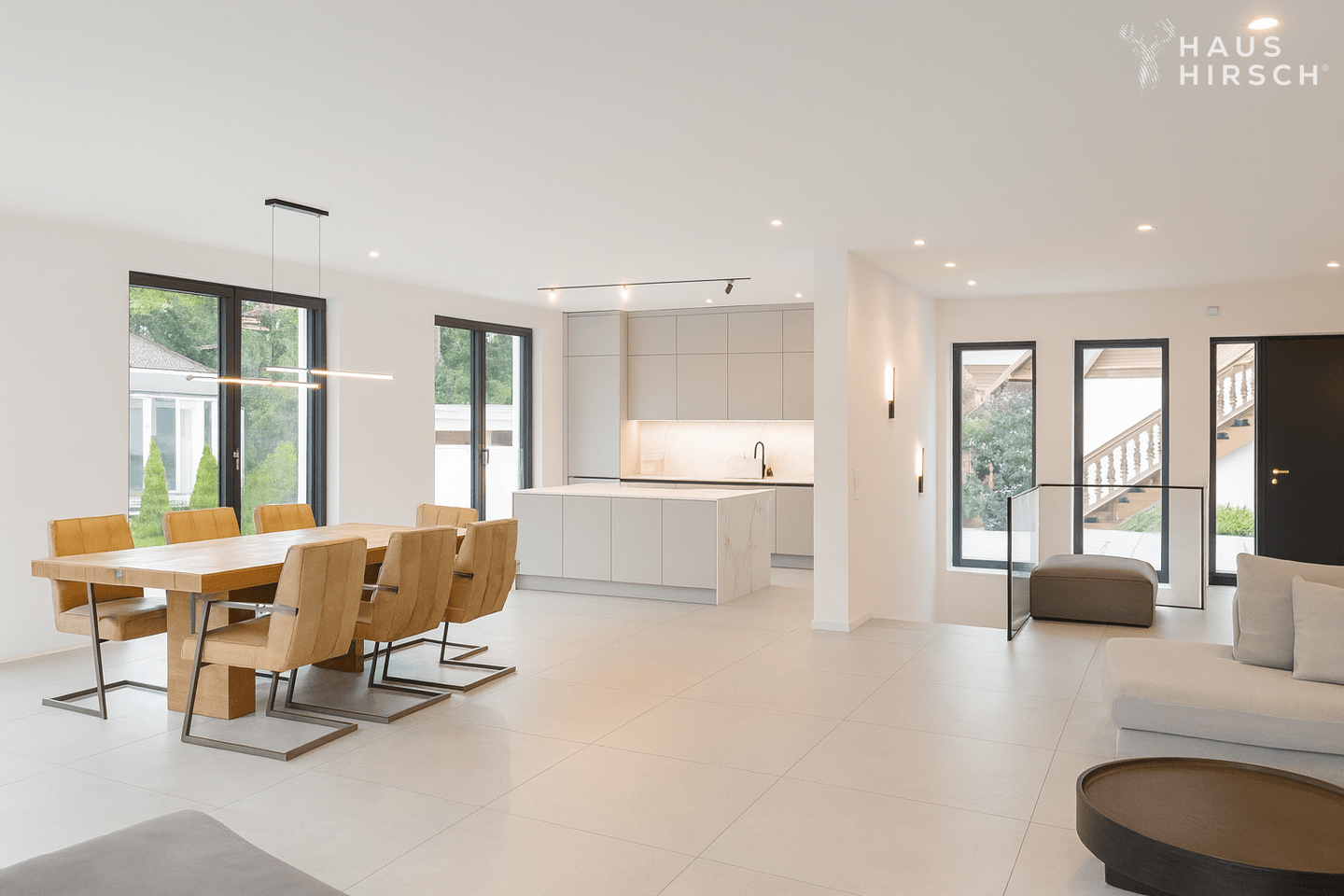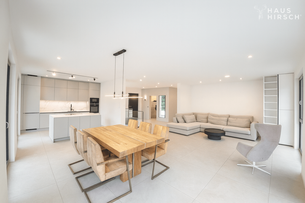 Bereits beim Betreten des Hauses wird die besondere Atmosphäre spürbar: eine offene Diele empfängt Sie mit klaren Linien, hochwertigsten Materialien und Blickachsen, die sich durch das gesamte Gebäude ziehen. Die Wohnräume begeistern mit Deckenhöhen von bis zu 2,70 m sowie raumhohen Fensterfronten, die ein einzigartiges Wechselspiel zwischen Innen und Außen schaffen. Das offene Raumkonzept verbindet Wohnen, Essen und Kochen auf elegante Weise und macht den Wohnbereich zum Mittelpunkt des Hauses – ein Ort, an dem Familie und Gäste gleichermaßen willkommen sind.