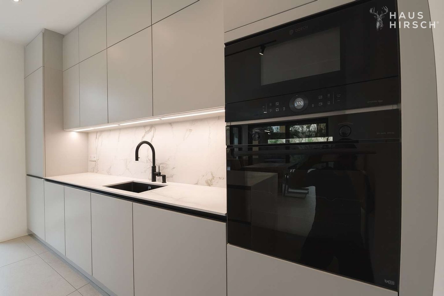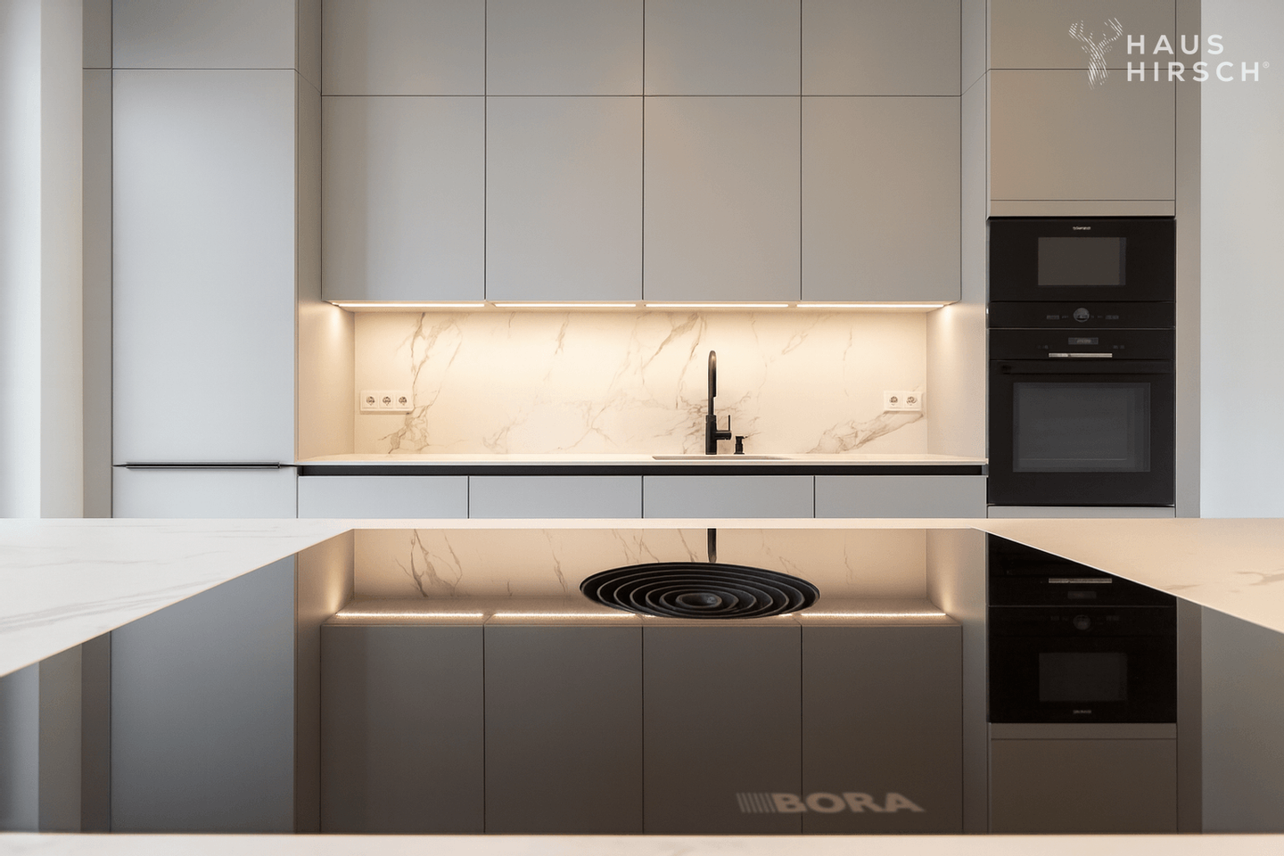 Die maßgefertigte Einbauküche ist ein weiterer Glanzpunkt. Mit eleganten Softlackfronten in Platingrau, einer Arbeitsplatte in Marmoroptik und einer großzügigen Kochinsel mit BORA-Induktionsfeld verbindet sie Design und Funktionalität. Ausgestattet mit BOSCH-Elektrogeräten der neuesten Generation, einem Quooker-Heißwassersystem und einer edlen schwarzen Keramikspüle wird die Küche zum Treffpunkt für Genuss und Geselligkeit.