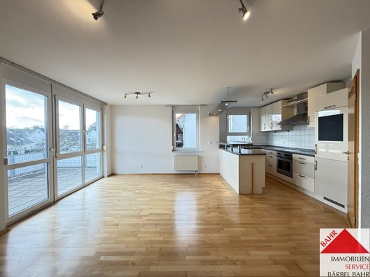 Großer Wohn-/ Essbereich mit Küche und Speisekammer.