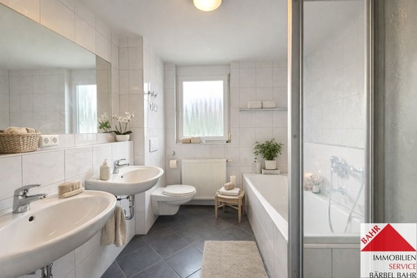 Separates Gäste-WC, Tageslichtbad mit Wanne und Dusche.