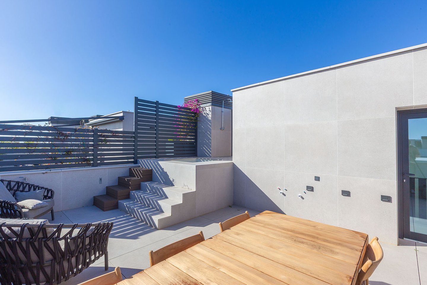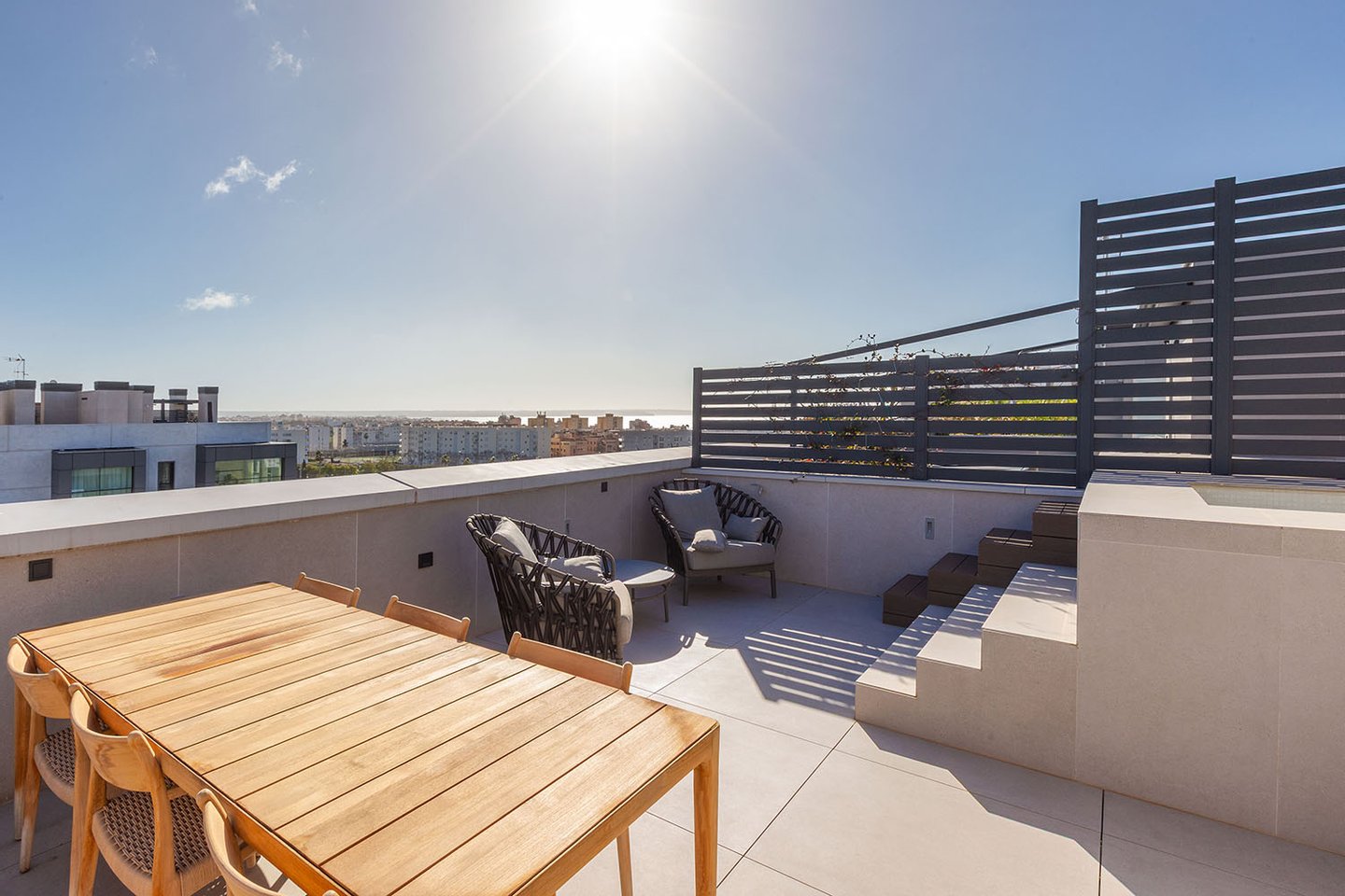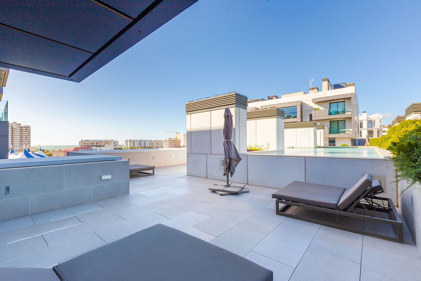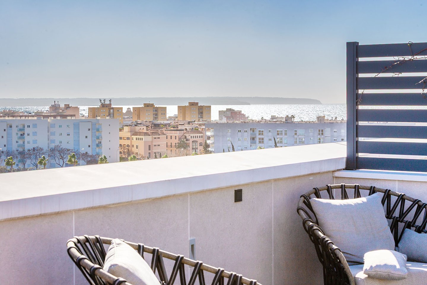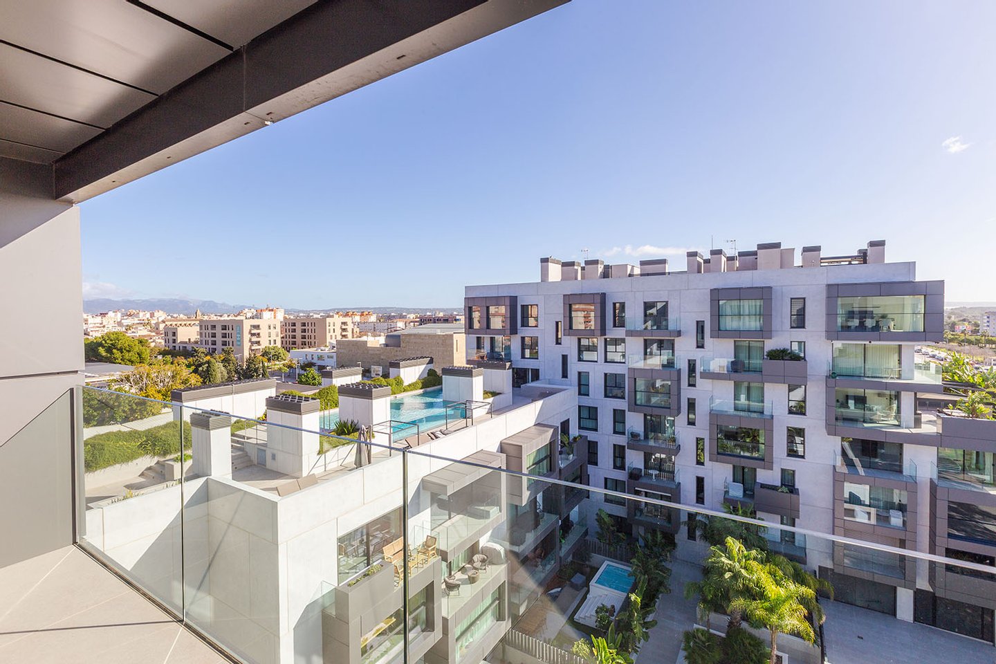 Das Penthaus selbst überzeugt mit einer anspruchsvollen, eleganten Ausstattung und großzügigen Räumen, die durch raumhohe Glaswände lichtdurchflutet sind und einen herrlichen Blick auf Palma freigeben. Zum Penthaus gehört eine 360° Panorama-Dachterrasse mit Privatpool, Jacuzzi und Barbecue-Bereich.