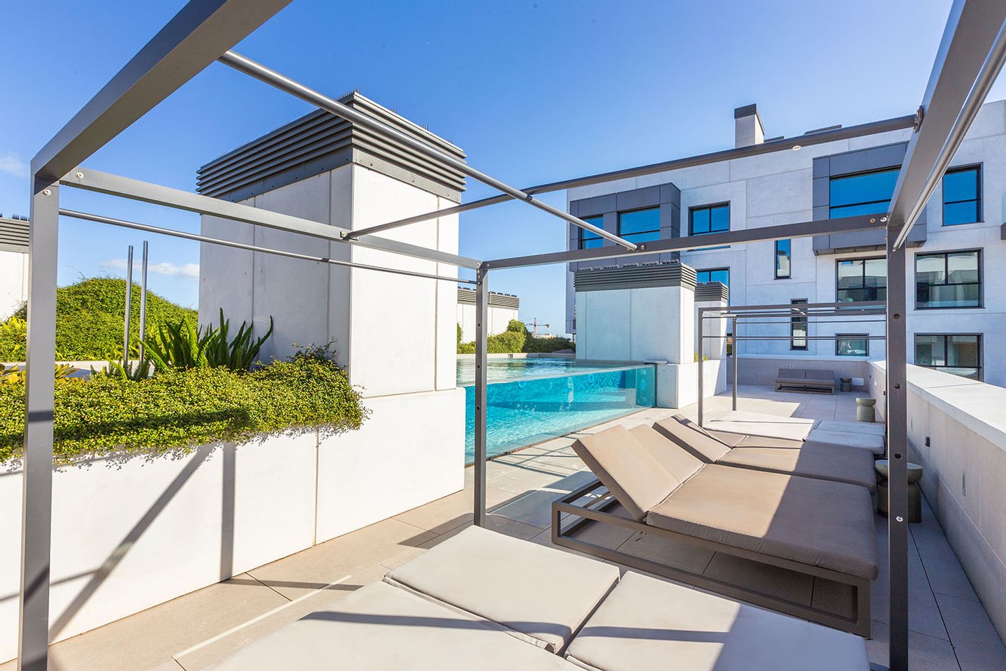 Die Anlage umfasst 80 Apartments und bietet eine beeindruckende Poollandschaft, eine stilvolle Gartenlounge, die mit Sauna und Dampfbad ausgestattet ist, sowie einen Fitnessbereich und Tiefgaragenplätze. Ein 24-Stunden-Concierge-Service, einschließlich Portierdienst, sorgt für ein Höchstmaß an Komfort und Sicherheit.