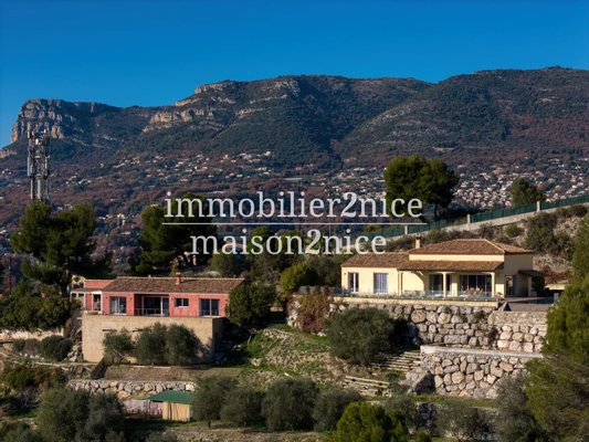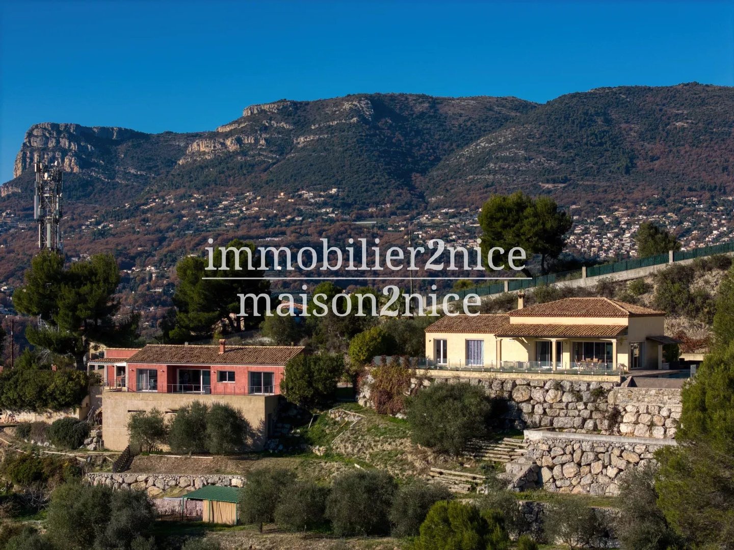 Auf den westlichen Hügeln von Nizza entdecken Sie diesen außergewöhnlichen Immobilienkomplex, der 2010 erbaut wurde. Sie besteht aus zwei unabhängigen einstöckigen Villen, die jeweils auf einem Grundstück von mehr als 6.000 m² in breiten, flachen Planken errichtet sind und mit Olivenbäumen und Weinbergen bepflanzt sind.