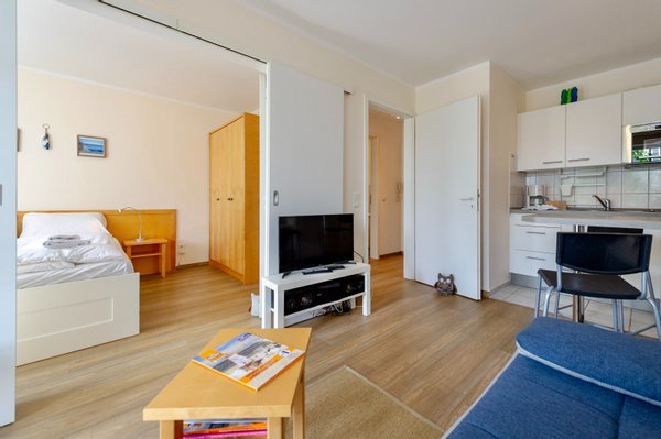 Das charmante 2-Raum-Appartement mit einer Wohnfläche von ca. 32,48 m² liegt im 1. Obergeschoss des Hauses „Mönchgut“. Die Einheit wird vollständig möbliert veräußert und überzeugt durch einen hellen, komfortabel gestalteten Wohnbereich mit integrierter Esstheke sowie einer funktionalen Küchenzeile. Ein separates Schlafzimmer mit Doppelbett sorgt für angenehme Rückzugsmöglichkeiten. Der Eingangsflur bietet Platz für eine Abstellkammer und führt in das im Jahr 2018 modernisierte Badezimmer mit Dusche. Abgerundet wird das Wohnangebot durch eine wettergeschützte Loggia mit attraktiver Süd-West-Ausrichtung, die zu entspannten Stunden im Freien einlädt. Zur Wohnung gehören zudem ein separater Kellerraum sowie ein gemeinschaftlicher Fahrradkeller. Ein PKW-Stellplatz in der Tiefgarage ist ebenso wie die komplette Möblierung bereits im Kaufpreis enthalten.