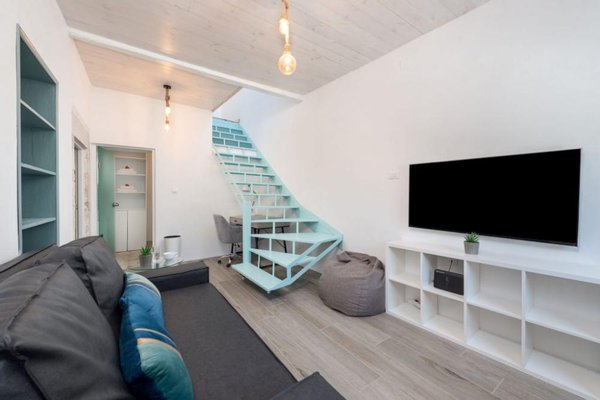 Eine Metalltreppe führt ins Obergeschoss mit einer voll ausgestatteten offenen Küche mit Essbereich und Zugang zum Balkon mit Blick auf die Umgebung und die Berge.