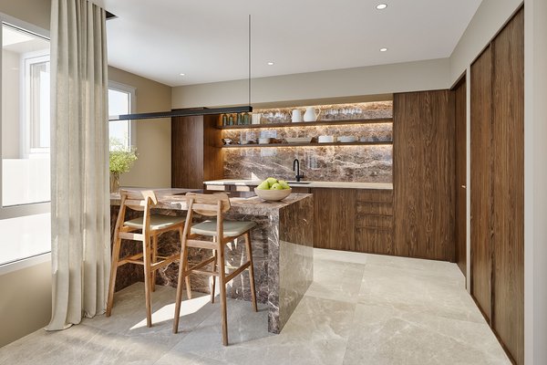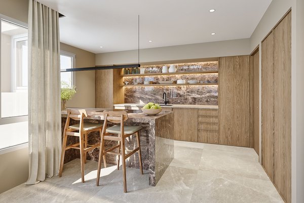 Die Küche setzt ein klares Design-Statement: Eine großzügige Naturstein-Kücheninsel, hochwertige maßgefertigte Holzfronten, integrierte Beleuchtung sowie klare Linien verbinden funktionale Perfektion mit zeitloser Ästhetik.