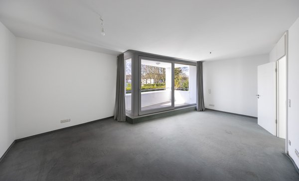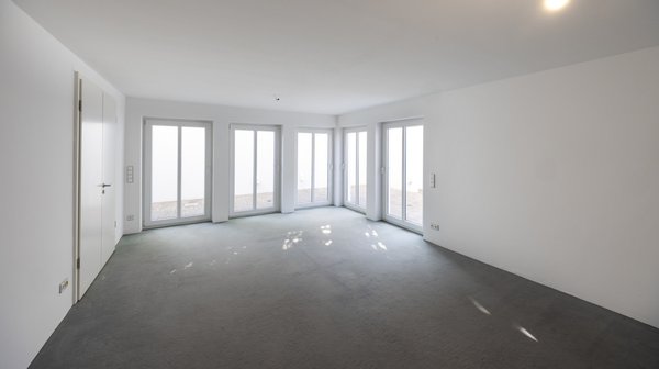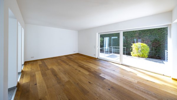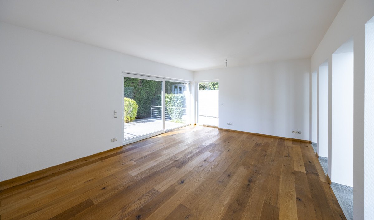 Der großzügige Wohnbereich überzeugt mit einem geschmackvollen Parkettboden und einem Ausblick auf die große, nicht einsehbare Süd-West-Terrasse. Eine bodentiefe Schiebetüranlage schafft einen fließenden Übergang zwischen Innen- und Außenbereich und lädt zu entspannten Stunden im Freien ein. Die Terrasse ist mit einer elektrischen Markise ausgestattet und bietet so ideale Voraussetzungen für gesellige Stunden im Freien. Dank der bodentiefen Fenster wirken alle Räume dieser Etage besonders lichtdurchflutet.