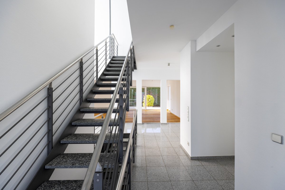 Auf einer großzügigen Wohnfläche von ca. 217 m² verteilen sich insgesamt fünf Zimmer über drei Ebenen und eröffnen vielfältige Möglichkeiten zur individuellen Nutzung und Gestaltung. Bereits beim Betreten des Hauses empfängt Sie ein moderner und einladender Entréebereich, von dem aus sämtliche Räume des Erdgeschosses bequem erreichbar sind. Eine offene Galerie bildet das Herzstück dieser Etage und eignet sich hervorragend als stilvoller Essbereich. Angrenzend befindet sich die helle, separate Küche. Der Eingangsbereich, die Küche, der Essbereich sowie das Gäste-WC sind mit einem eleganten Granitboden ausgestattet.