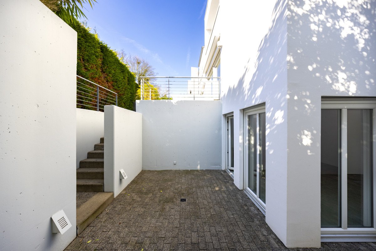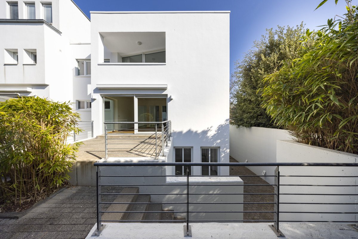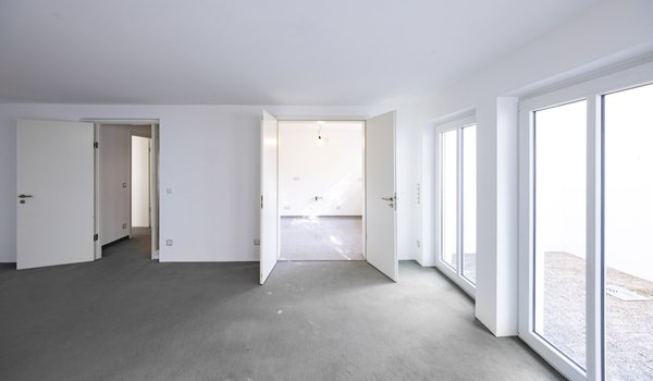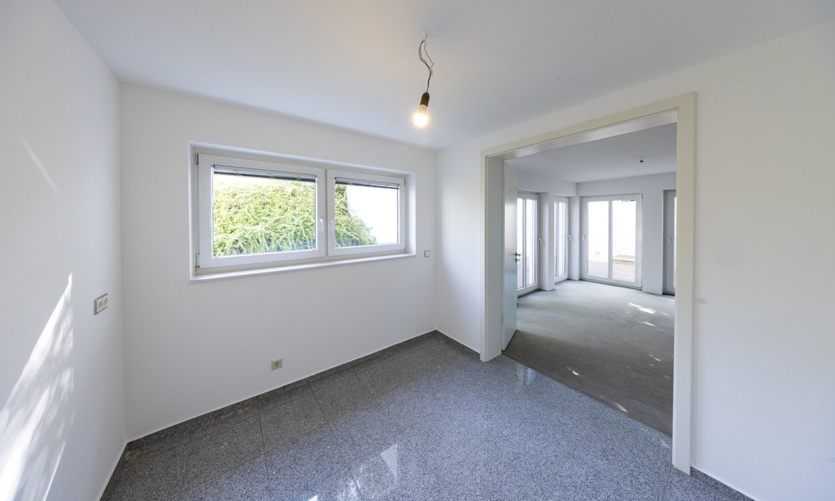 Das Gartengeschoss erweitert das Raumangebot um eine weitere flexible Wohnebene. Zwei zusätzliche Zimmer, ein Badezimmer sowie eine praktische Waschküche eröffnen vielseitige Nutzungsmöglichkeiten. Diese Etage eignet sich beispielsweise ideal als Büro, Gästebereich oder für ein älteres Kind. Große Fenster sorgen auch hier für viel Helligkeit und ermöglichen den direkten Zugang zu einem gepflasterten Lichthof mit großzügiger Terrasse. Über eine Treppe gelangen Sie von hier aus auch in den oberen Gartenbereich.