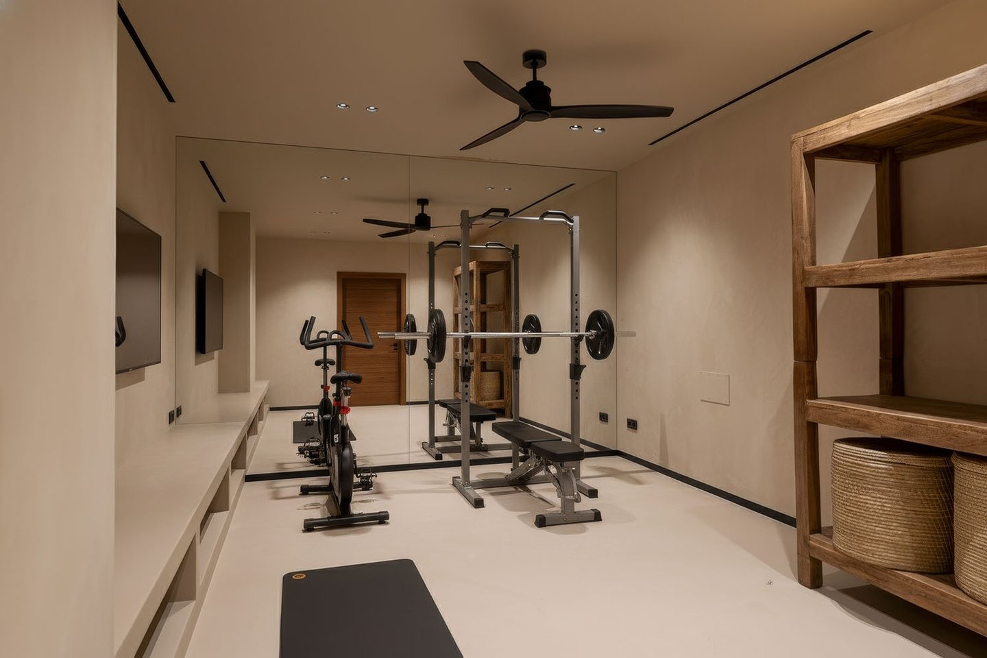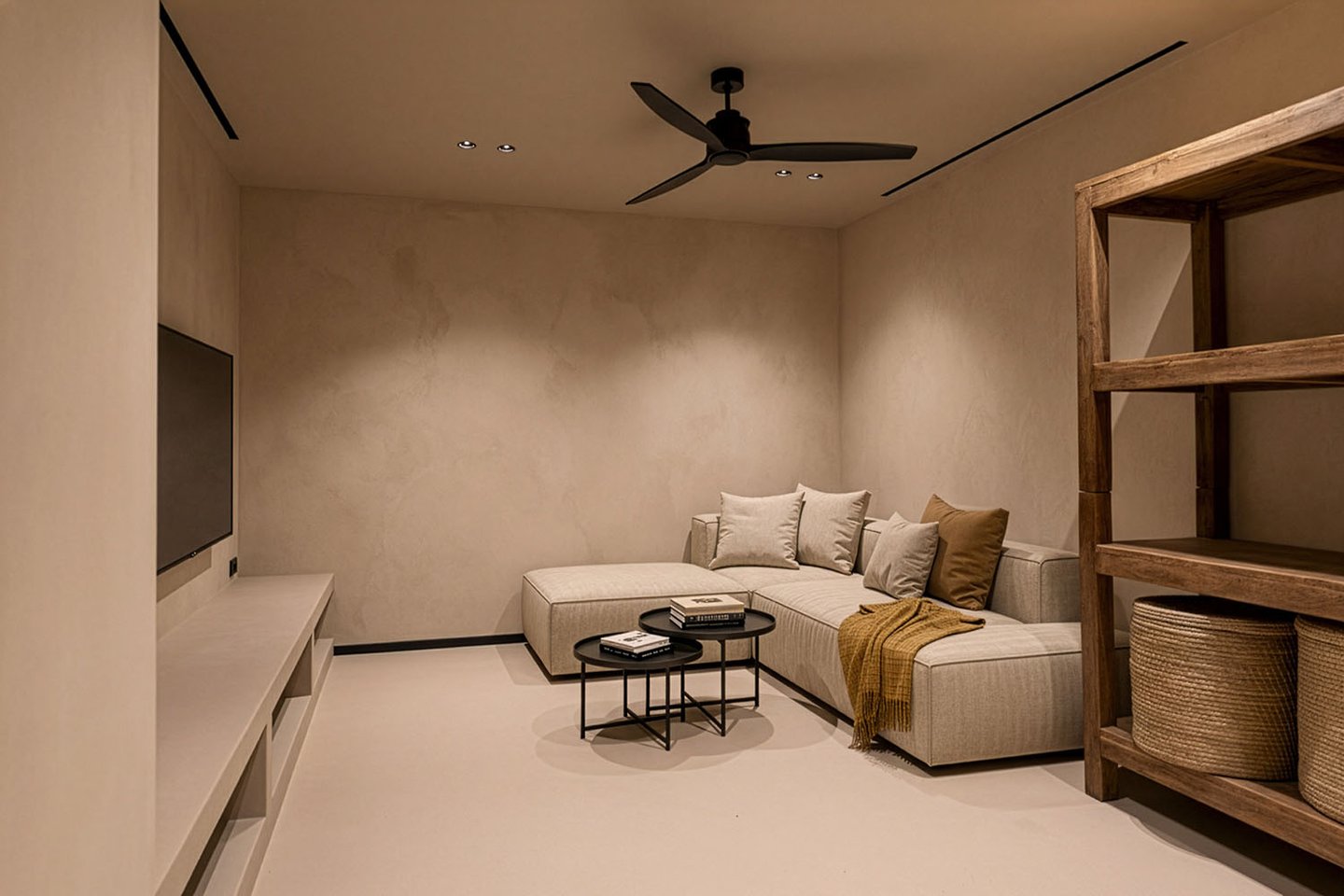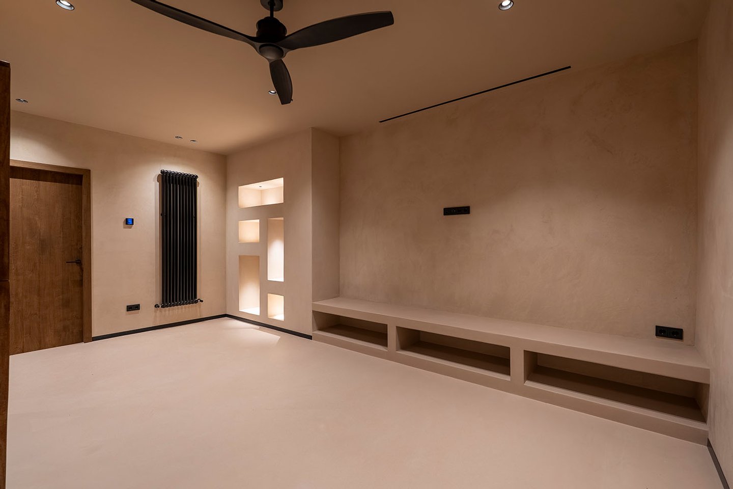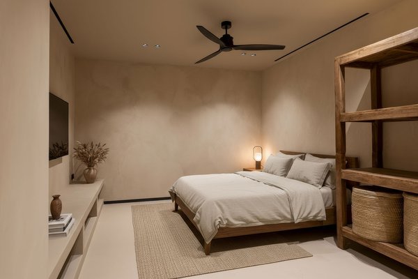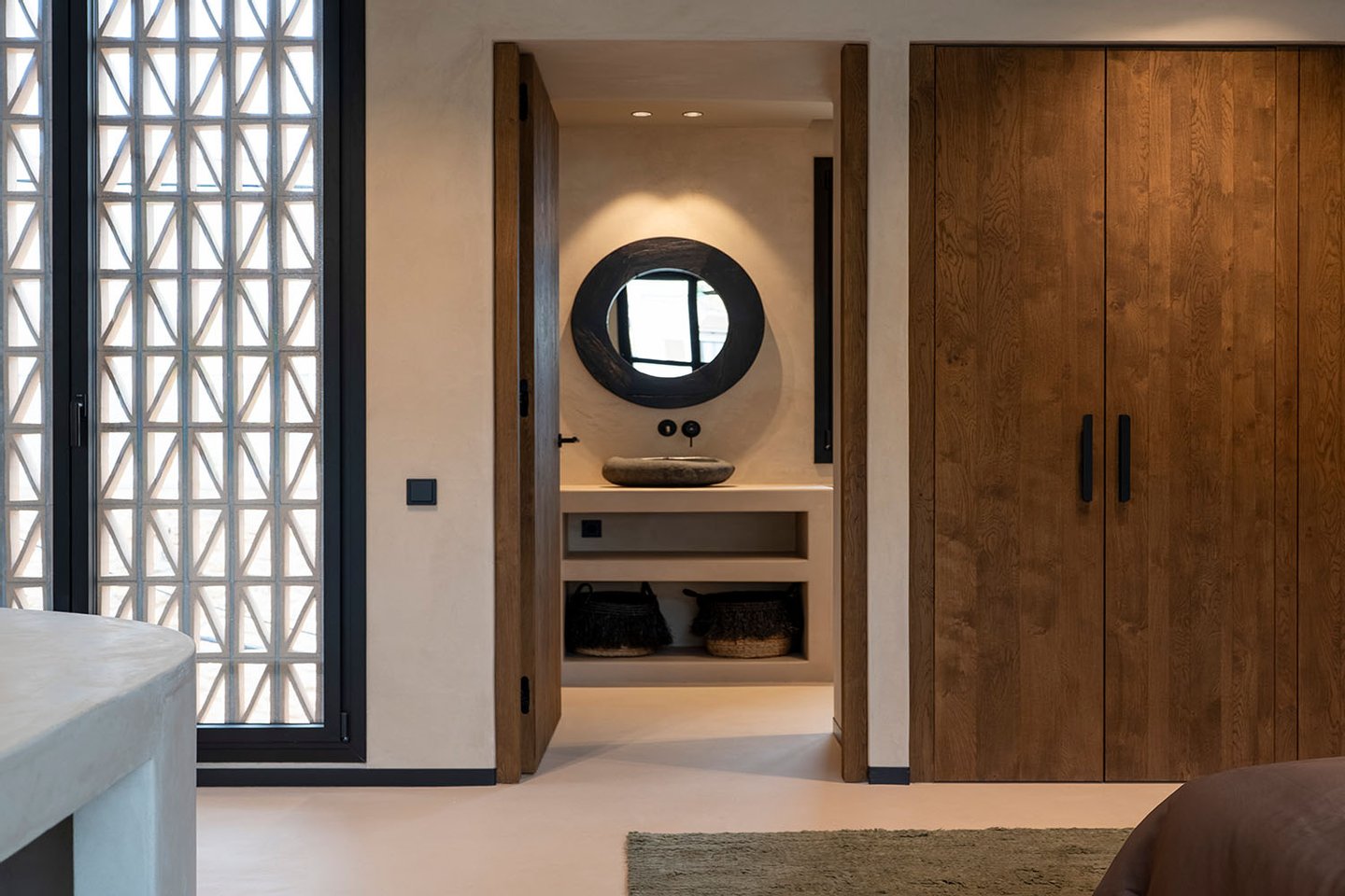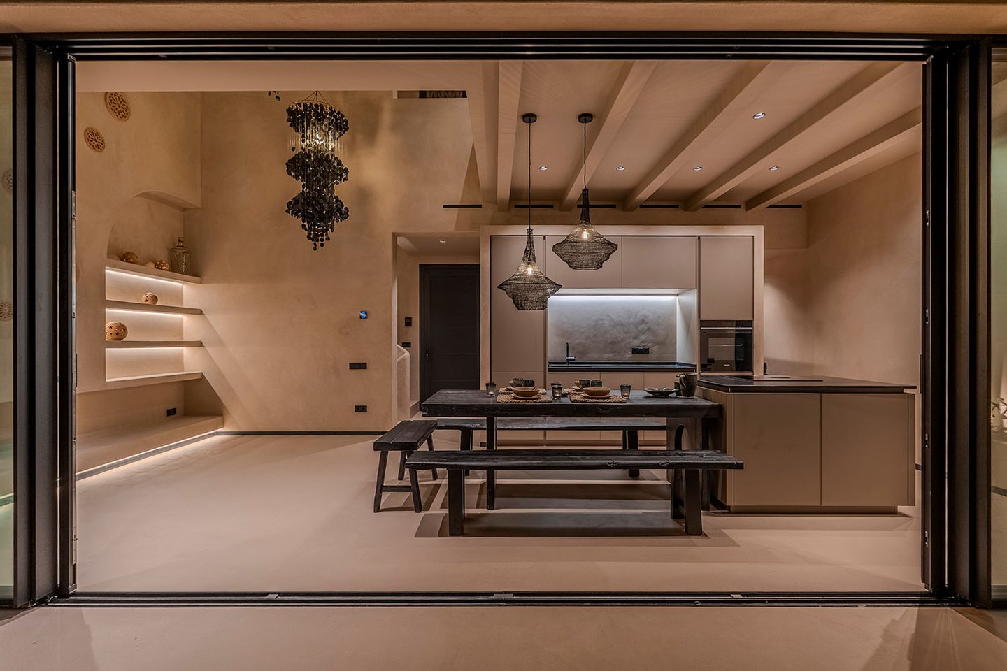 Bei der Planung wurde konsequent auf höchste Qualität bei Baustoffen und Ausstattungselementen geachtet. Das klar strukturierte Innendesign ist bis ins Detail durchdacht: Natürliche Materialien wie Kalkmörtel und Holz in Verbindung mit gezielt eingesetzten Lichtquellen schaffen ein hochwertiges, zeitloses Wohnambiente. Bodentiefe Schiebetüren, die vollständig in den Wänden verschwinden, ermöglichen einen fließenden Übergang zwischen Innen- und Außenbereich zu der Terrasse mit Salzwasserpool.