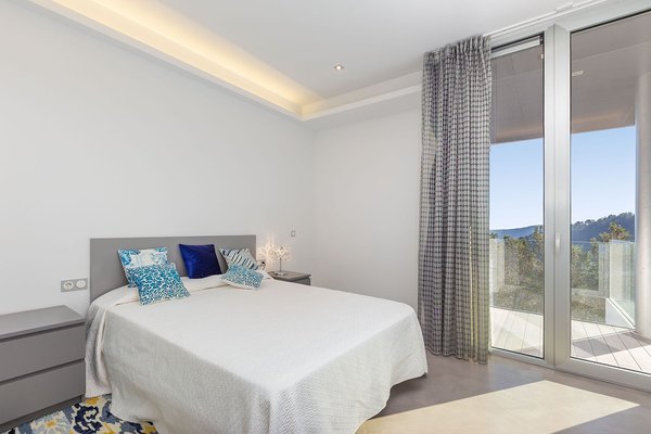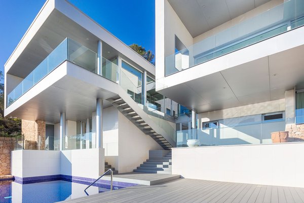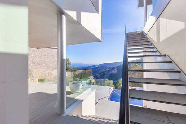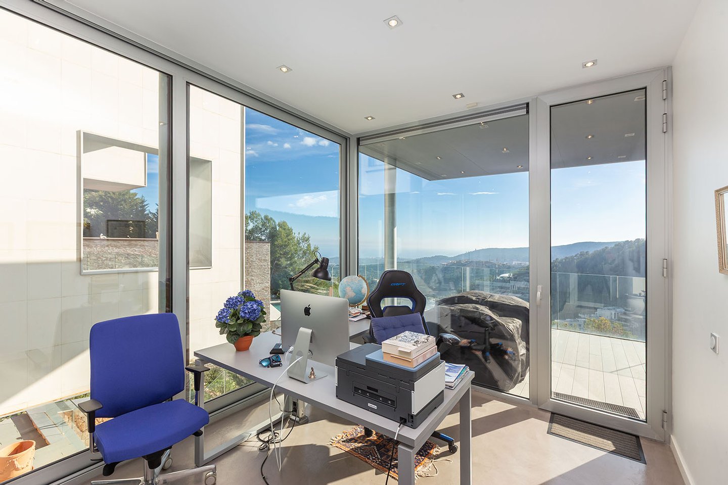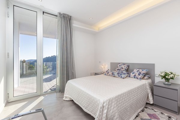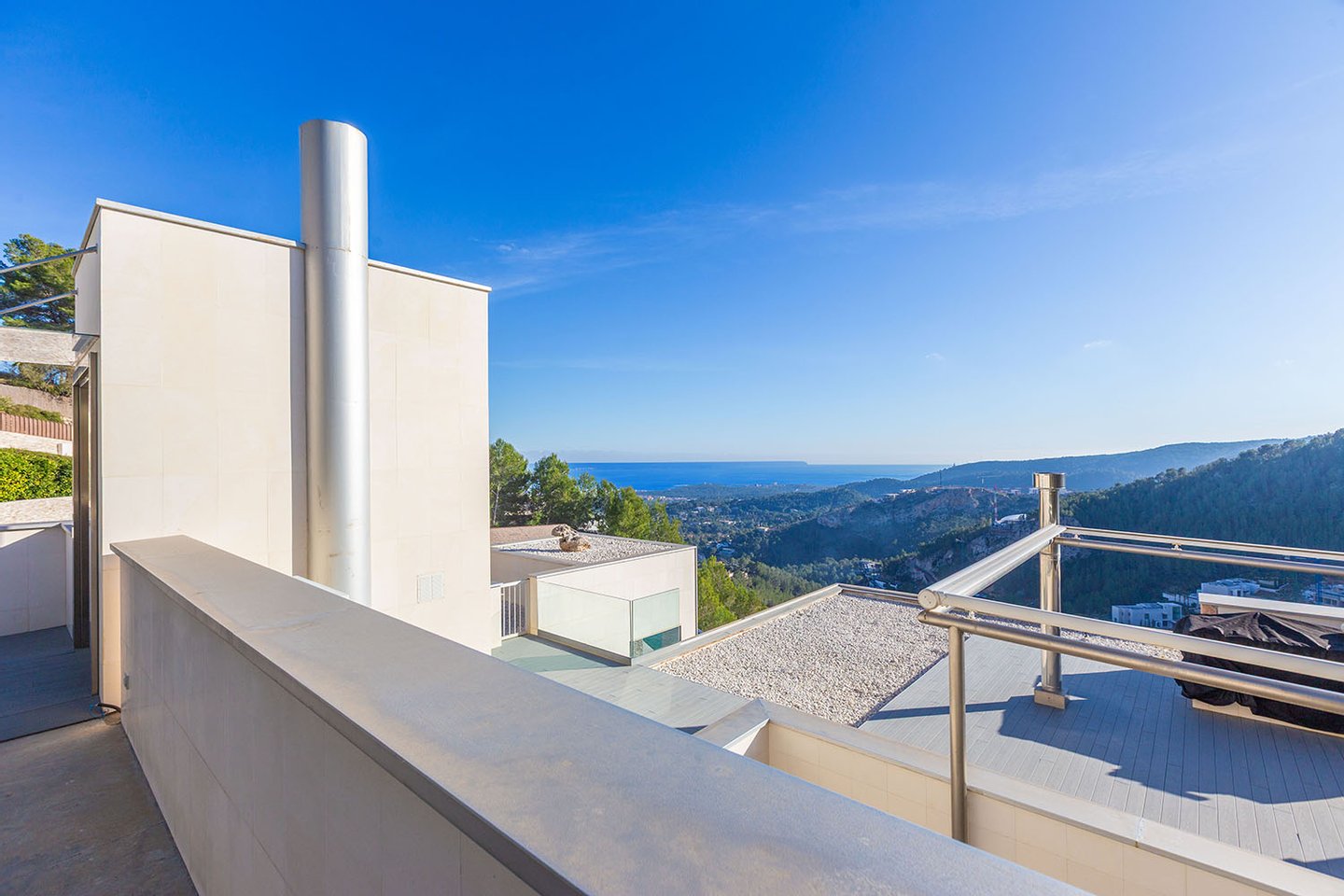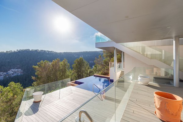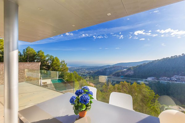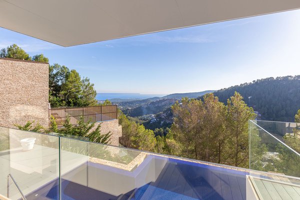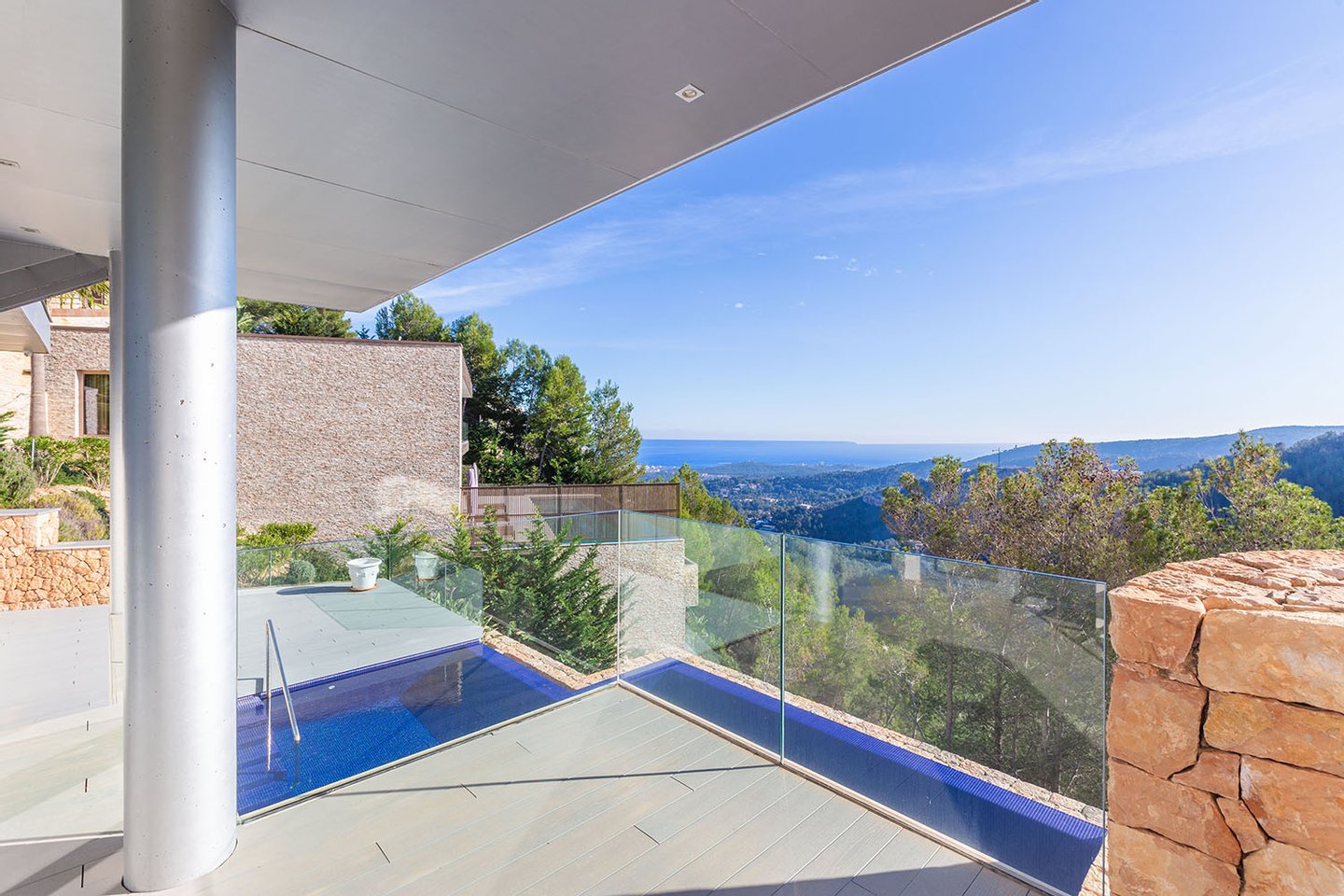 Diese moderne Villa mit eindrucksvollem Meerblick befindet sich in einer der begehrtesten Wohnlagen Mallorcas, im oberen, besonders ruhigen Bereich von Son Vida. Das 2.184 m² große Grundstück liegt in einer Sackgasse direkt an einer Grünzone und