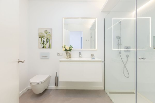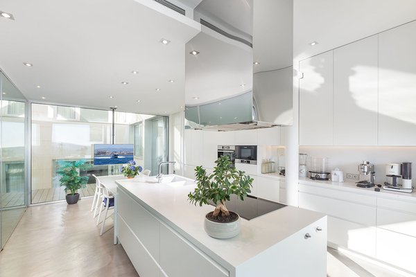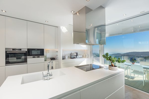 Die geräumige Küche ist zeitgemäß gestaltet und mit hochwertigen Bosch-Geräten sowie einer eleganten Arbeitsfläche aus Krion ausgestattet. Ein besonderes Highlight bildet die Dachterrasse mit stilvollem Lounge-Bereich und Sommerküche, von der aus sich ein unvergleichlicher Ausblick auf das Mittelmeer genießen lässt. Auf dieser Ebene befinden sich zudem der Doppelcarport sowie der Zugang zum Aufzug.