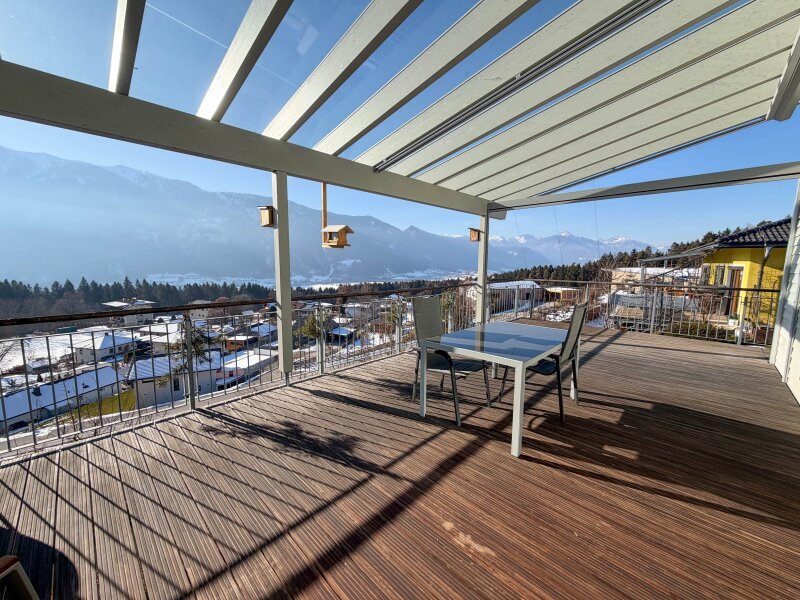 - Terrassenüberdachung mit Sicherheitsglas sowie Markise für Sonnenschutz + Windschutz seitlich