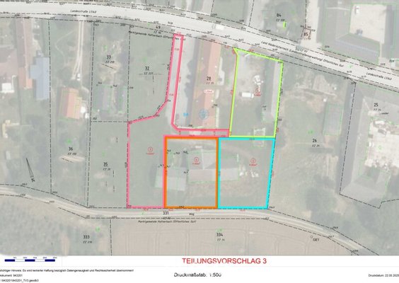 Die Liegenschaft befindet sich im Bauland-Agrar, was zahlreiche Verwertungsoptionen eröffnet. Ein vorläufiger Teilungsentwurf sieht die Möglichkeit vor, im rückwärtigen Bereich des Grundstücks vier Bauparzellen zu schaffen – ideal für Bauträger oder private Projekte.