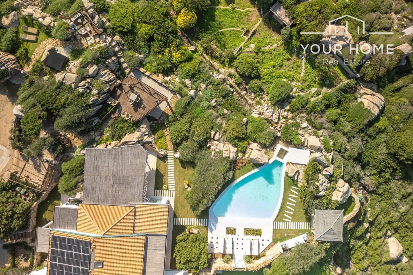 Auf dem 1500 mq großen Grundstück gibt es eine Reihe von Veranden, Wacholder, englischen Rasenflächen und farbenfrohen, duftenden Blumen, außergewöhnlichen Entspannungsbereichen mit einer Hydromassage-Wanne oder faszinierenden Orten für Mittagessen im Freien; ein großes Schwimmbecken, in dem man tauchen kann, um sich von der heißen Sonne zu erfrischen, und zwei Terrassen, von denen aus man einzigartige Panoramen genießen kann. Um diese Außenbereiche zu bereichern, gibt es außerdem eine Außenküche, ein komplettes Beleuchtungssystem, ein automatisches Bewässerungssystem und vier Innenparkplätze, während weitere Außenparkplätze verfügbar und im Besitz sind.