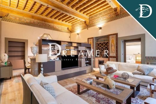 Exclusive, completely renovated frescoed apartment for sale in the center of Florence. Located on the first floor of a stately building on Lungarno Guicciardini, the property has been tastefully furnished with designer furniture and comprises a total of 360 sqm with three bedrooms and four bathrooms.