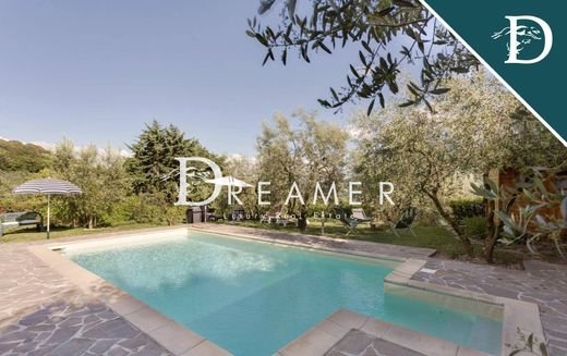 Freestanding on four sides, the villa is surrounded by a lush garden of approximately 5,000 sqm, featuring a splendid swimming pool with a solarium and magnificent views of the surrounding hills. Numerous private parking spaces ensure maximum convenience.