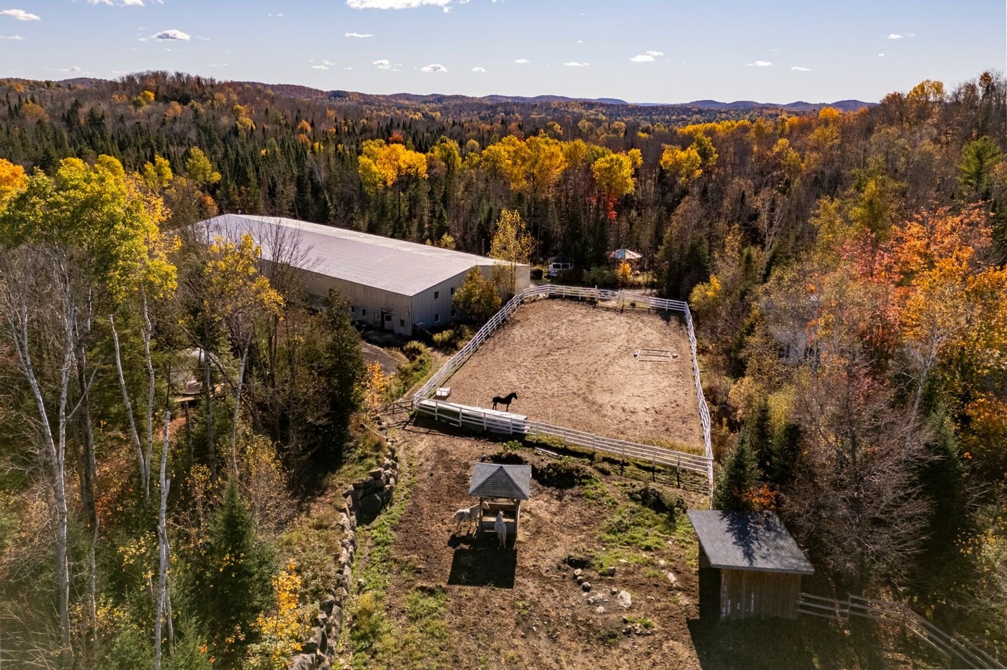 Ein wahrer Friedenszufluchtsort nur wenige Minuten von Estérel in den Laurentians entfernt, verbindet dieses über 20 Hektar große Reitanwesen ländlichen Luxus mit purer Natur. Ein viktorianisches Haus mit fünf Schlafzimmern und beheiztem Pool und