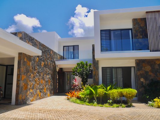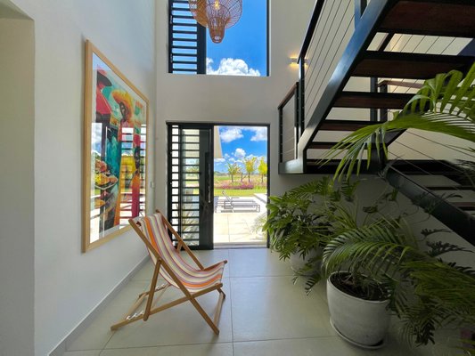 Diese wunderschöne, zweistöckige Villa mit vier Schlafzimmern befindet sich in der exklusiven Ocean River Villas Enklave innerhalb des Azuri Ocean & Golf Village in Haute Rive. Mit Blick auf den Golfplatz, umgeben von üppigen Gärten und offenem Grün