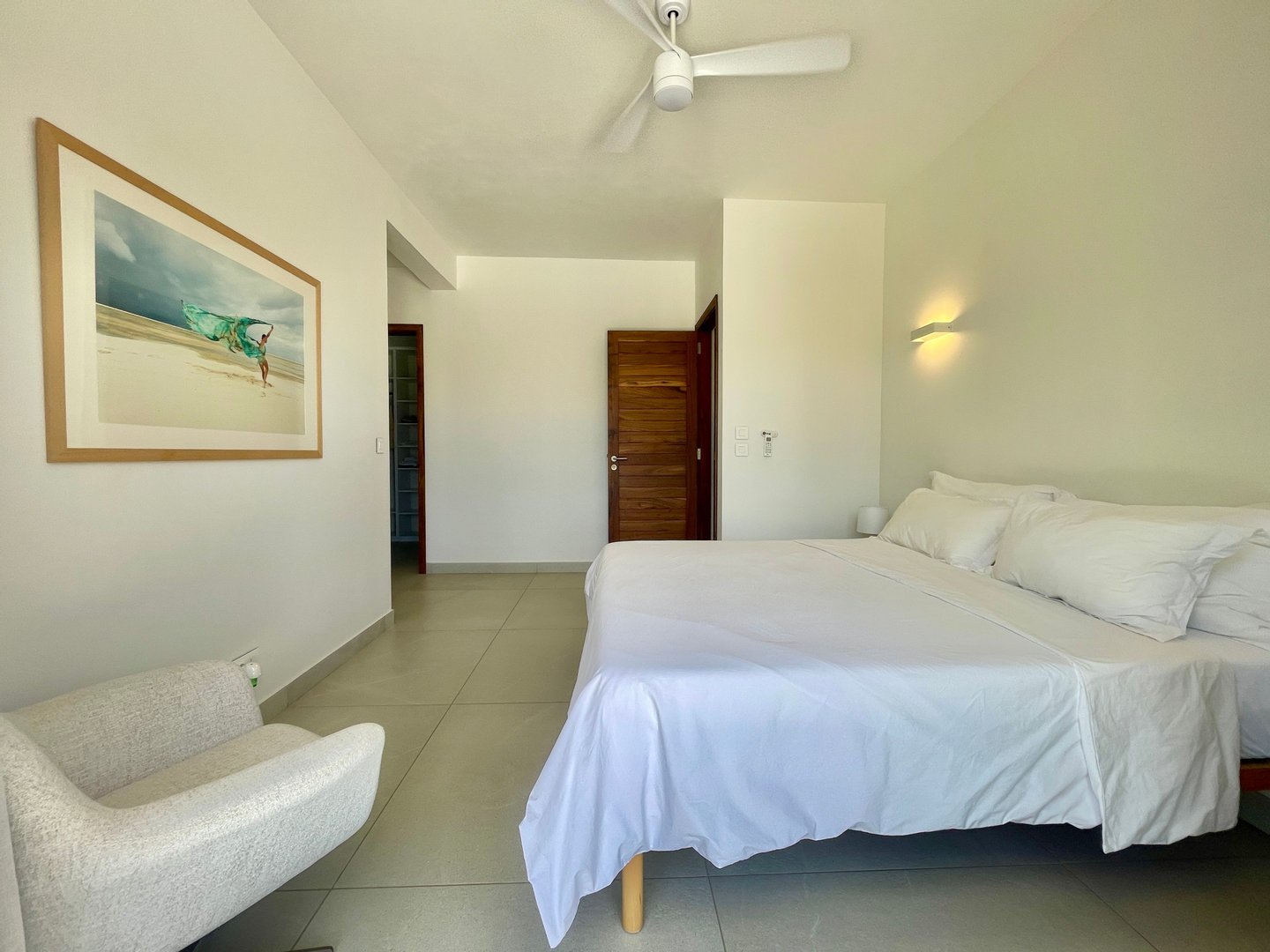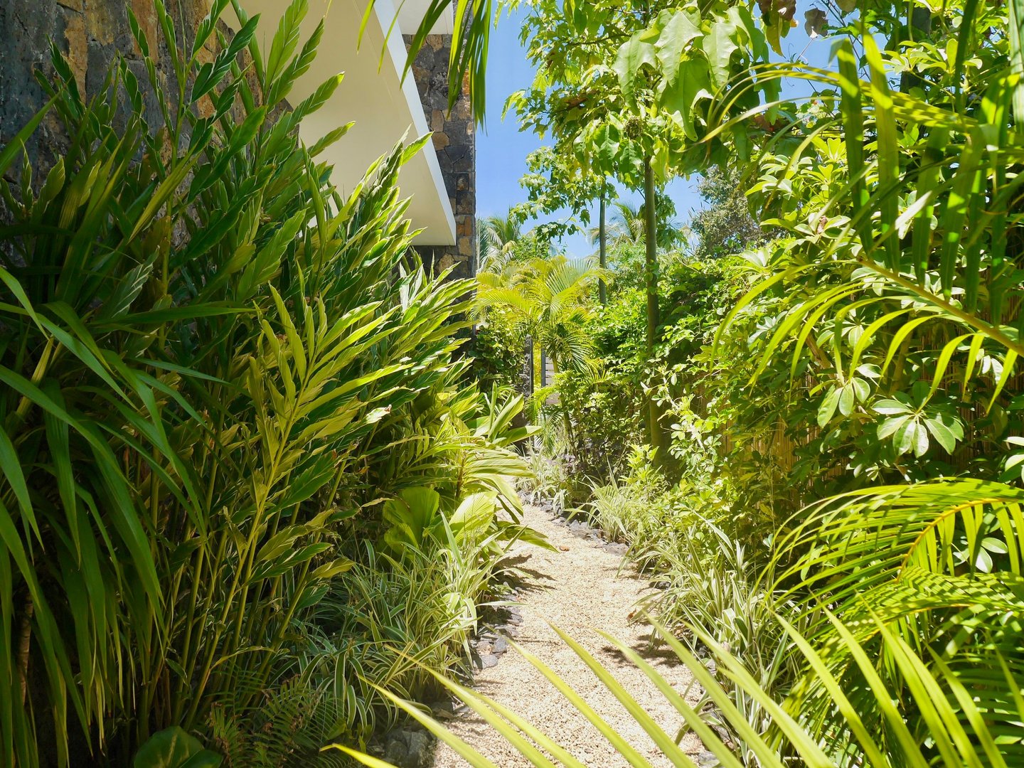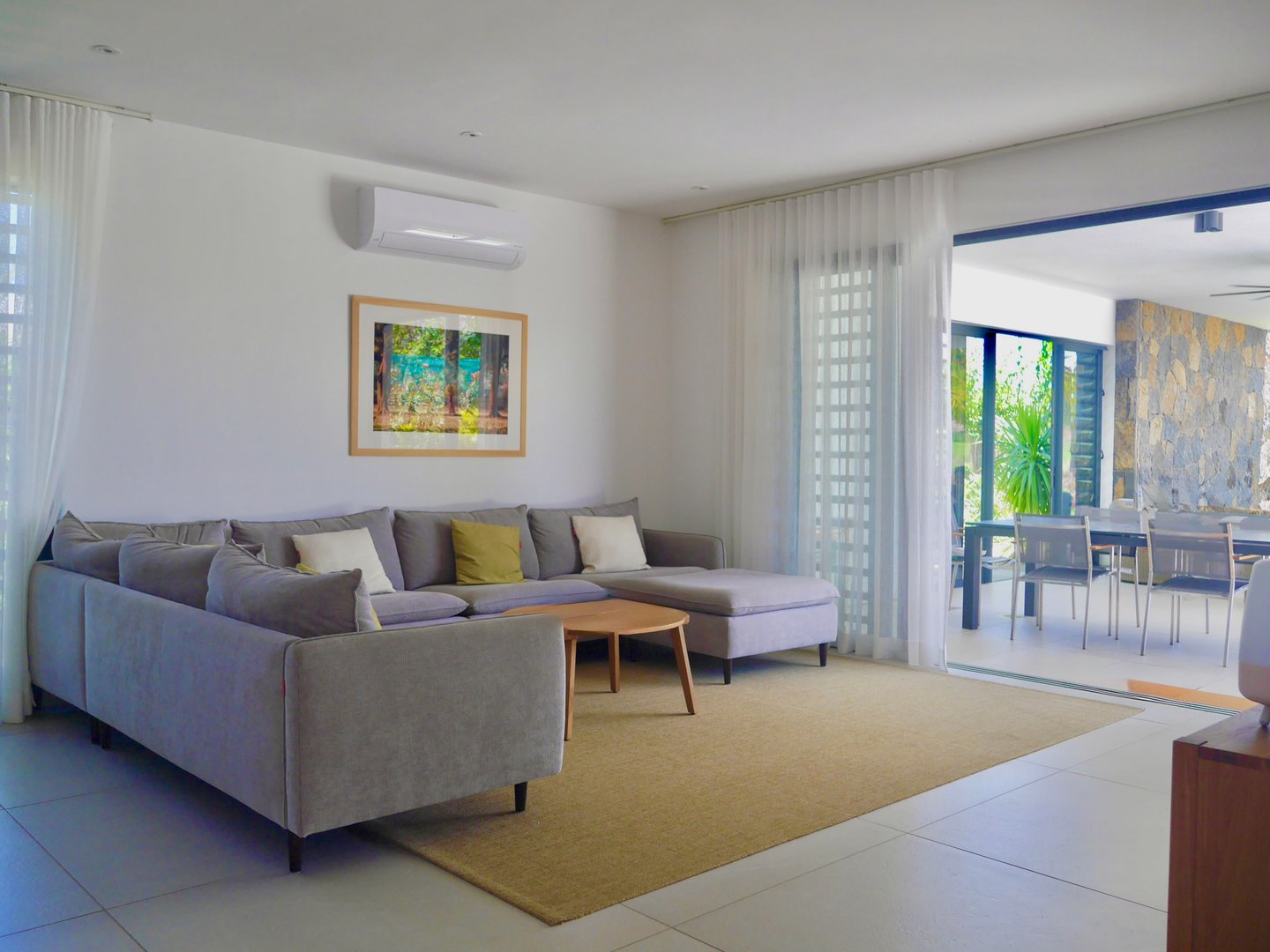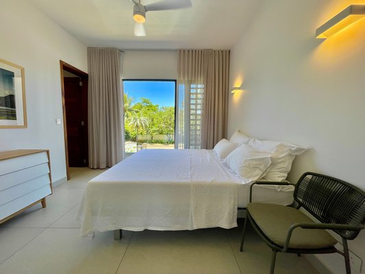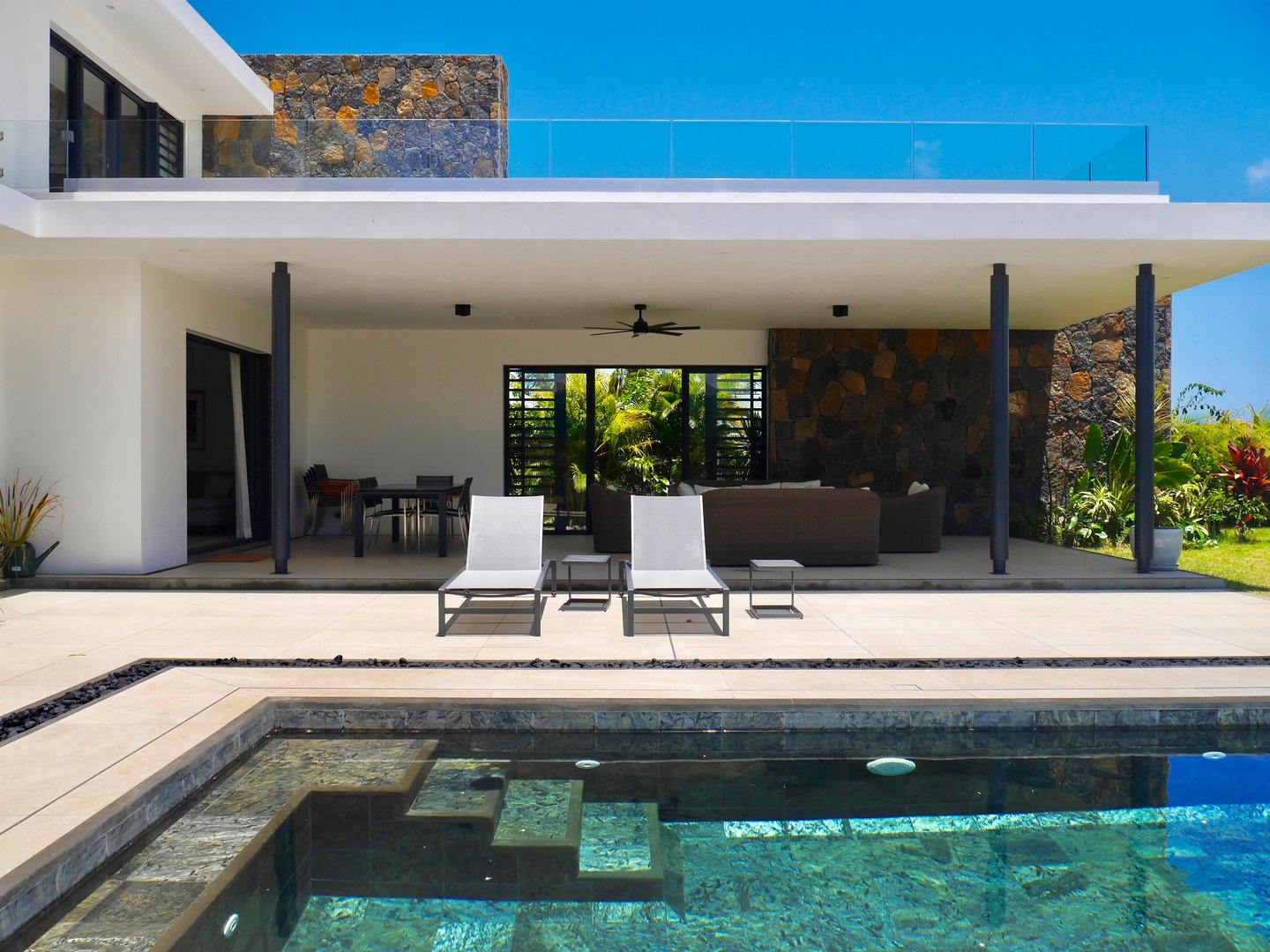 Das Erdgeschoss verfügt über einen großzügigen, offenen Wohn- und Essbereich, der nahtlos in den Garten, die Außenterrasse und den privaten Pool übergeht. Große Fenster und Schiebetüren lassen natürliches Licht den Raum füllen und rahmen die Aussicht auf den Pool und die tropische Landschaft ein. Die Villa verfügt über eine voll ausgestattete Designerküche, eine praktische Hinterküche, einen Waschraum und eine Gästetoilette. Diese Ebene bietet außerdem eine Master-Suite mit Blick auf Pool und Garten sowie ein zusätzliches Schlafzimmer mit eigenem Bad.