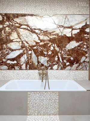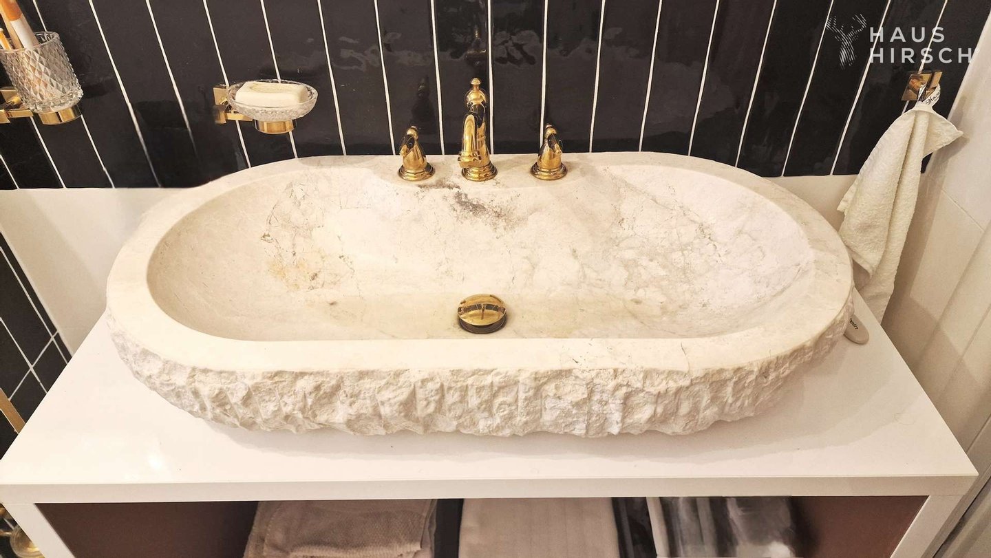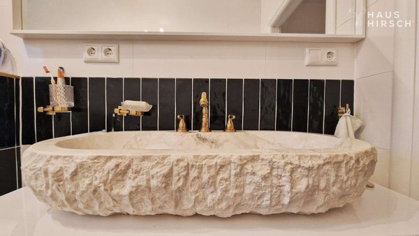 Im Dachgeschoss befinden sich ein weiterer Wohn- und Essbereich, ein Gästezimmer, eine integrierte Büroecke sowie ein großzügiges Badezimmer. Dieses überzeugt mit Badewanne, Waschmaschinenanschluss und detailreicher Marmorverkleidung, die sich über die Badewanne zieht. Ein Dachfenster über der Wanne unterstreicht das exklusive Design durch natürliches Licht. Auch hier sorgen hochwertige Armaturen und ein massiver Marmortisch für ein luxuriöses Erscheinungsbild.