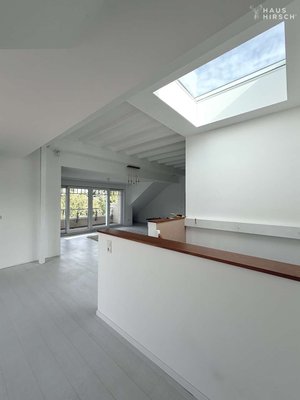 Sichtbare Holzelemente, Dachschrägen und große Velux-Fenster schaffen ein wohnliches Ambiente, das sich ideal als Büro-, Gäste- oder Hobbybereich eignet.