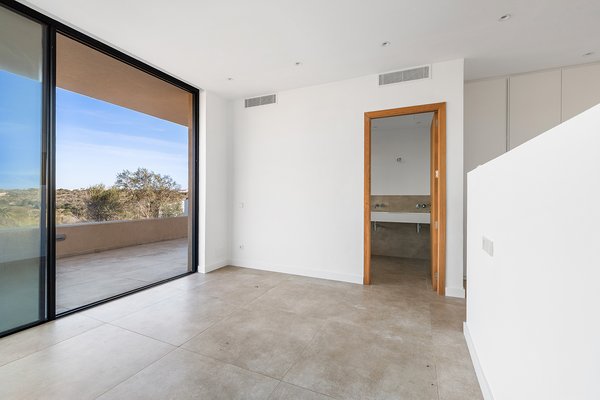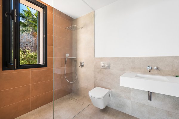 Dank der Hanglage verteilen sich 3 weitere Schlafzimmer mit jeweils eigenem Bad en Suite auf das untere Geschoss. Zwei dieser Zimmer bieten direkten Zugang zu einer weiteren Terrasse.