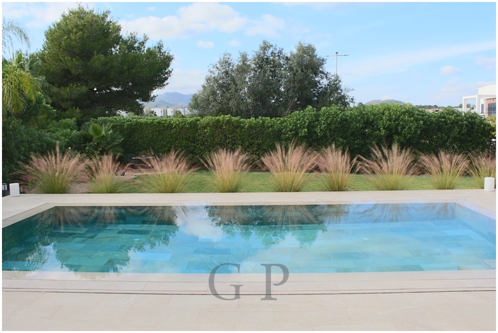Highlight ist dann sicherlich die große Sonnenterrasse, in die der Überlaufpool (alle Seiten) mit Gegenstromanlage eingelassen ist. Dadurch, dass die Wasseroberfläche Terrassen-Niveau ist, gibt es eine besondere Optik. Der Pool wird mit Salzwasser betrieben.