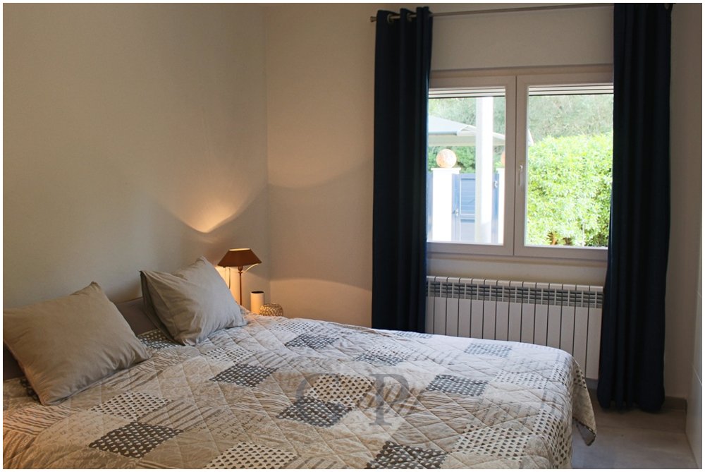 Die Wohnfläche von ca. 150 qm befindet sich auf einer Ebene nur geteilt von drei Stufen in den Wohn-Essbereich. Im vorderen Bereich befinden sich die drei Schlafzimmer, die zwei Bäder, von denen eins en Suite ist, und das Gäste-WC. Vom Flur geht es in das Wohnzimmer mit
