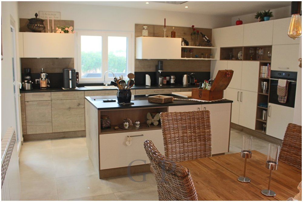 einem Specksteinkaminofen und in die Wohnküche mit Kochinsel.