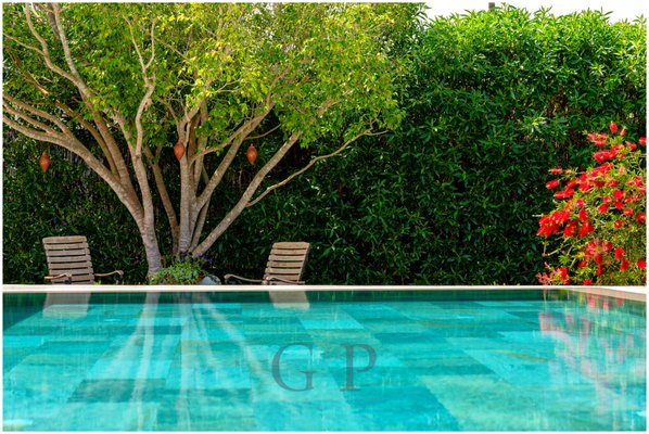 Highlight ist dann sicherlich die große Sonnenterrasse, in die der Überlaufpool (alle Seiten) mit Gegenstromanlage eingelassen ist. Dadurch, dass die Wasseroberfläche Terrassen-Niveau ist, gibt es eine besondere Optik. Der Pool wird mit Salzwasser betrieben.