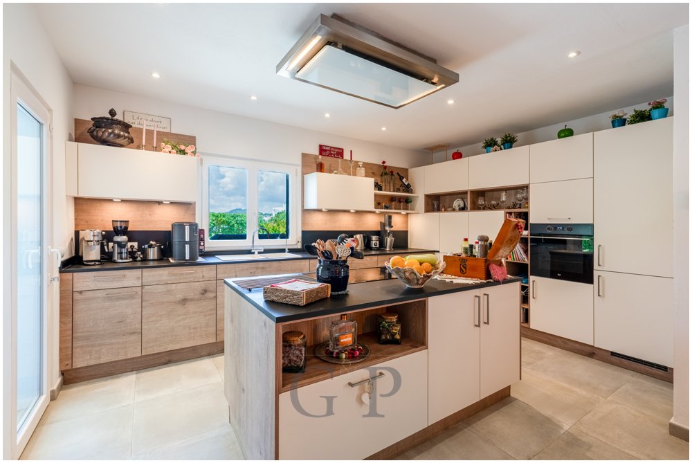 einem Specksteinkaminofen und in die Wohnküche mit Kochinsel.