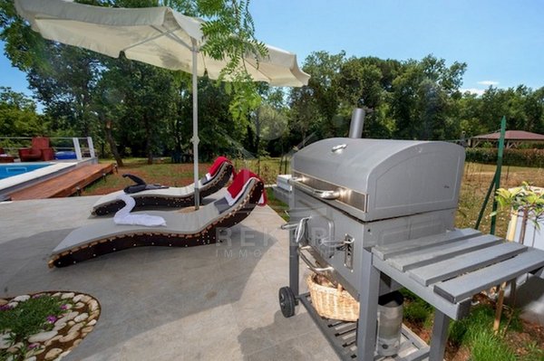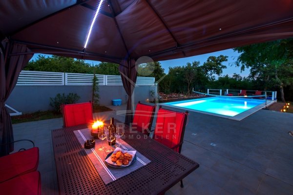 Besonders attraktiv zeigt sich der Außenbereich. Der rund 919 m² große Garten vermittelt echtes Hausgefühl und bietet viel Privatsphäre. Vom Wohnbereich aus betreten Sie die Terrasse und gelangen weiter in den Garten. Dort stehen Ihnen ein ca. 40 m² großer Swimmingpool, ein Gartenhaus und eine gepflegte Grünfläche zur Verfügung. Die Nähe zum Wald sorgt für Ruhe und einen freien Blick ins Grüne. Eine seltene Kombination in Poreč.