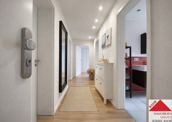Vom Flur aus sind alle Räume zugänglich. Neben dem Schlafzimmer, das Kinder- oder Arbeitszimmer steht Ihnen ein Tageslichtbad zur Verfügung, ausgestattet mit Eckbadewanne, bodengleicher Dusche, Waschbecken und Toilette.