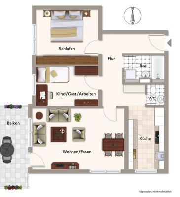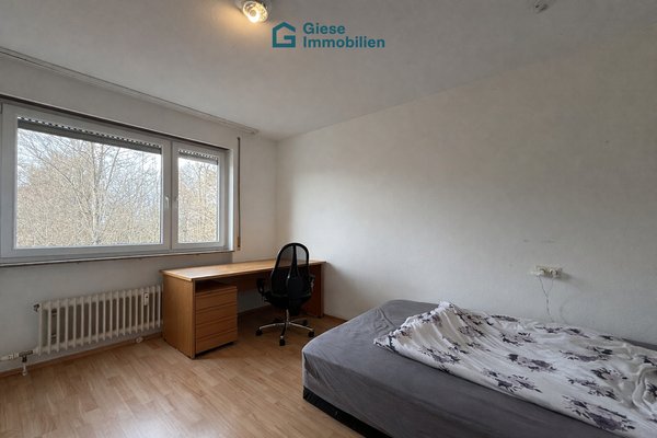 Das großzügige Wohnzimmer bildet den Mittelpunkt der Wohnung und bietet ausreichend Platz, um einen Wohn- und Essbereich in einem Raum zu integrieren. Von hier aus gelangt man auf den Balkon, der mit einem schönen Blick auf den angrenzenden Wald einlädt.