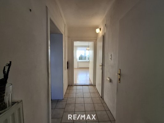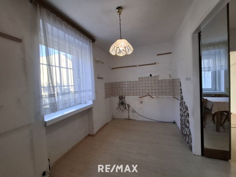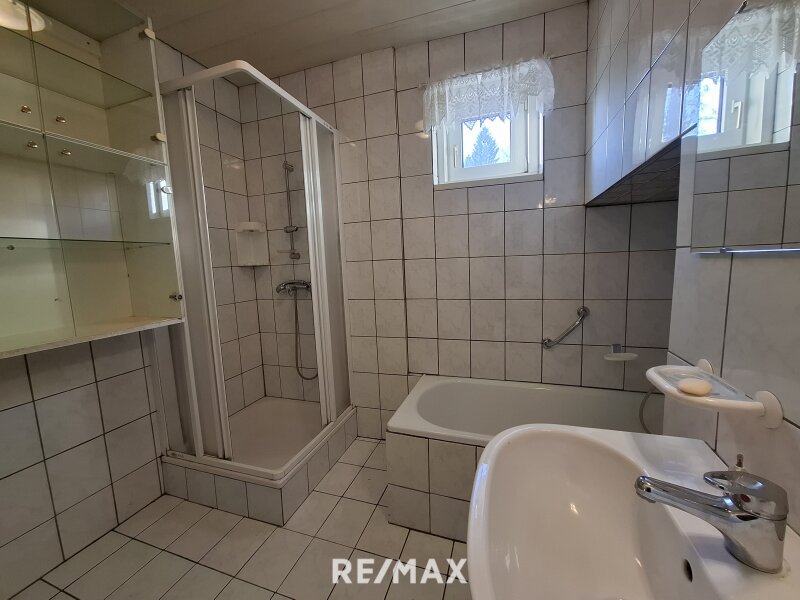 Im Erdgeschoss betreten Sie die Wohnung über einen zentralen Vorraum, der in alle Räumlichkeiten führt. Hier befinden sich ein Esszimmer sowie eine unmöblierte Küche, ein Kinderzimmer, das Schlafzimmer und ein Badezimmer mit Badewanne, Dusche und WC.