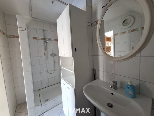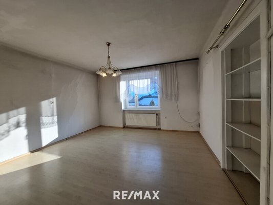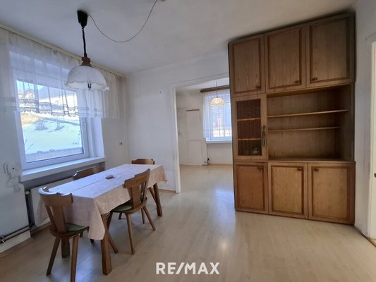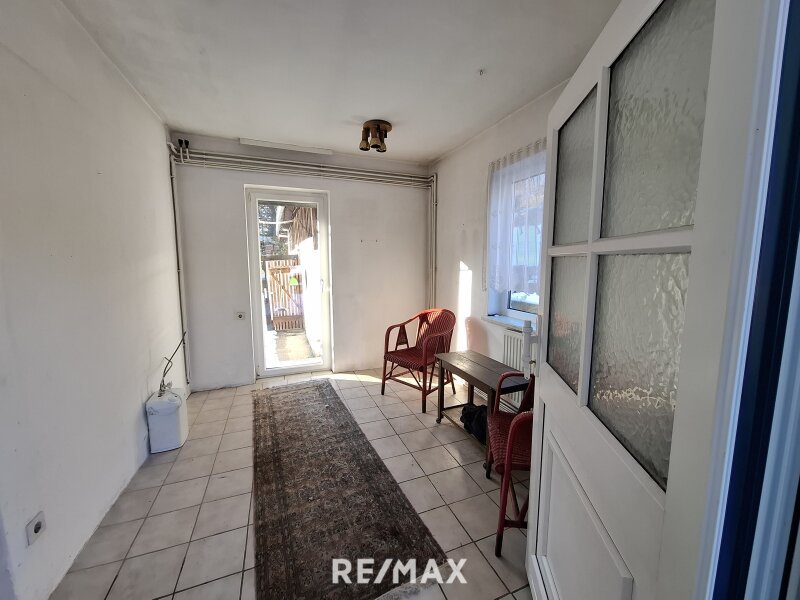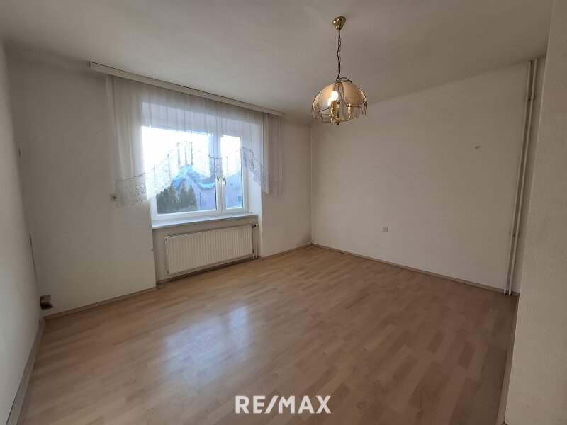 Im Erdgeschoss betreten Sie die Wohnung über einen zentralen Vorraum, der in alle Räumlichkeiten führt. Hier befinden sich ein Esszimmer sowie eine unmöblierte Küche, ein Kinderzimmer, das Schlafzimmer und ein Badezimmer mit Badewanne, Dusche und WC.