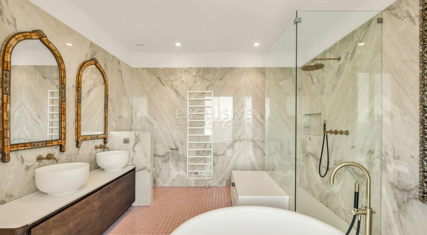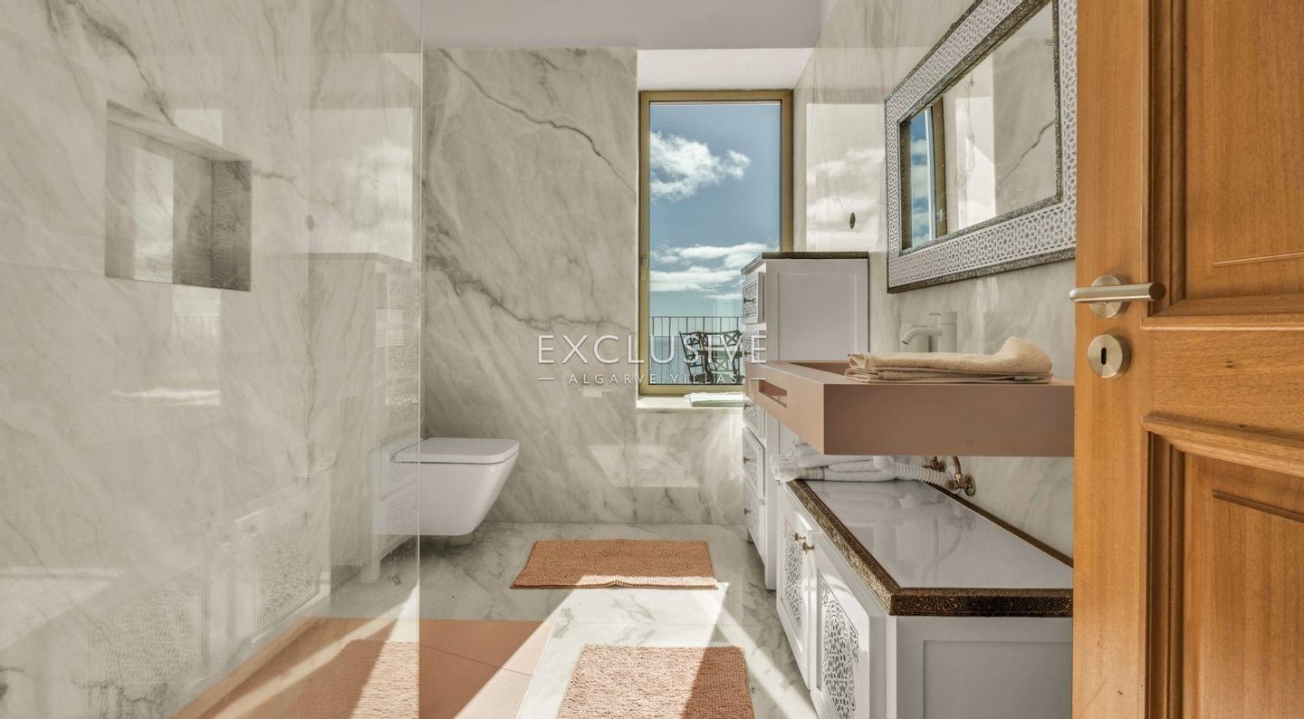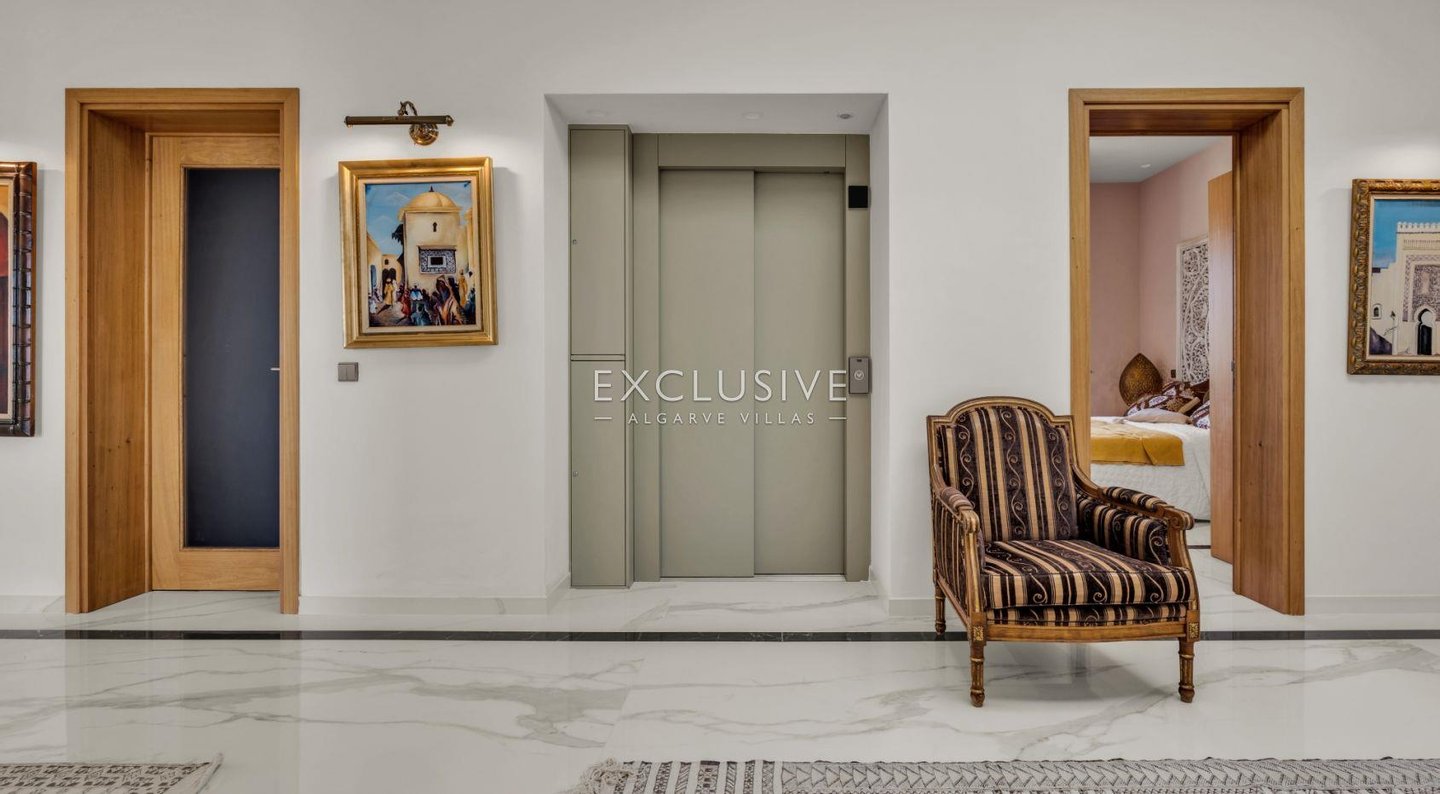 Über die Treppe oder den privaten Aufzug, der alle Ebenen bedient, erreichen Sie 6 Schlafzimmer im ersten Stock, von denen 5 ein eigenes Bad haben. Das Hauptschlafzimmer ist das Prunkstück mit großem Badezimmer, Doppelwaschbecken und angrenzendem begehbarem Raum, der zum Schlafzimmer führt. Die private Terrasse bietet einen Blick auf das Meer und die Ponta de Piedade.