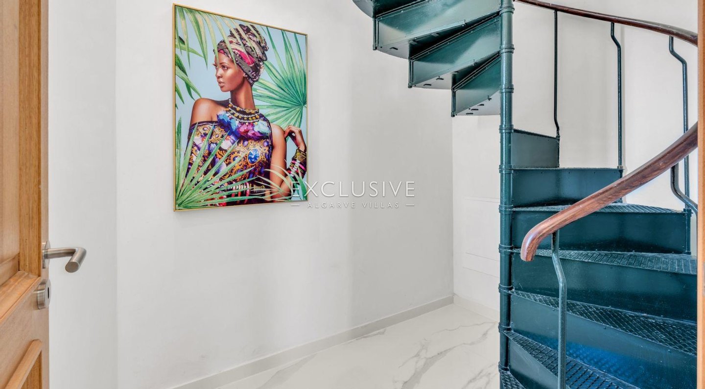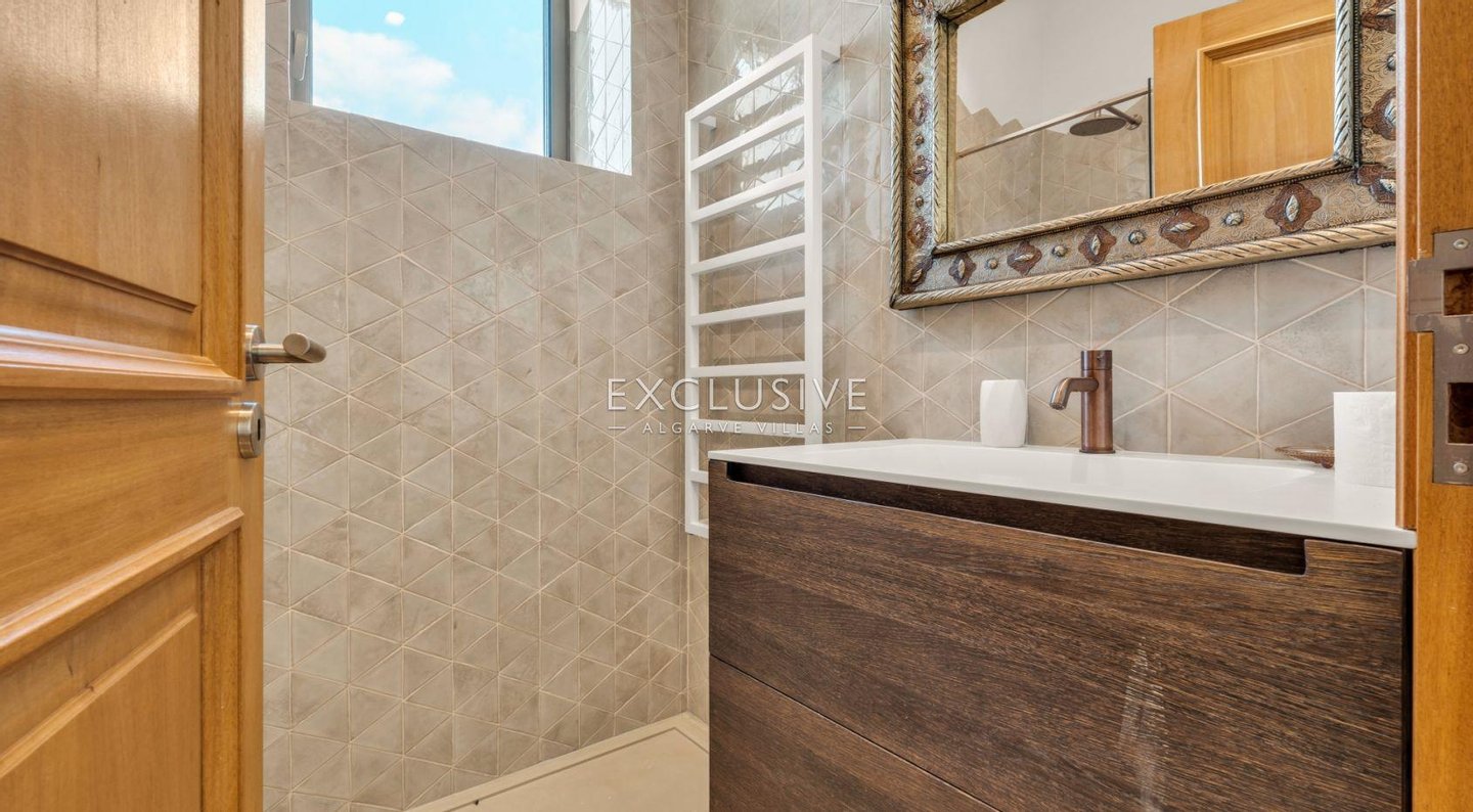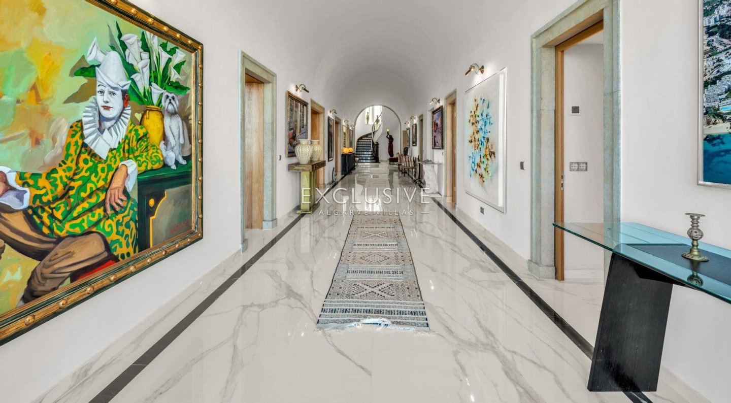 Über die Treppe oder den privaten Aufzug, der alle Ebenen bedient, erreichen Sie 6 Schlafzimmer im ersten Stock, von denen 5 ein eigenes Bad haben. Das Hauptschlafzimmer ist das Prunkstück mit großem Badezimmer, Doppelwaschbecken und angrenzendem begehbarem Raum, der zum Schlafzimmer führt. Die private Terrasse bietet einen Blick auf das Meer und die Ponta de Piedade.
