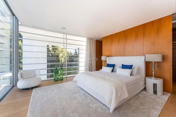 Sieben Schlafzimmersuiten sind sorgfältig über alle Ebenen des Hauses verteilt und bieten Privatsphäre und Platz für Gäste und Familie gleichermaßen. Im Erdgeschoss befinden sich drei Suiten, die jeweils einen direkten Zugang zu einer nach Süden ausgerichteten Terrasse bieten. Zwei weitere Suiten, darunter das prächtige Hauptschlafzimmer, befinden sich im ersten Stock. Die Hauptsuite ist ein Refugium aus Raum und Licht, mit einem riesigen Badezimmer mit zwei begehbaren Duschen, einer freistehenden Badewanne, zwei Waschbecken und einem geräumigen begehbaren Kleiderschrank. Diese Suite bietet auch Zugang zu einer umlaufenden privaten Terrasse mit Blick auf den See und den Pool mit Blick auf den Golfplatz. Zwei weitere Gästesuiten befinden sich auf der unteren Ebene des Anwesens, darunter ein Homeoffice, das auf Wunsch leicht in ein achtes Schlafzimmer umgewandelt werden kann.